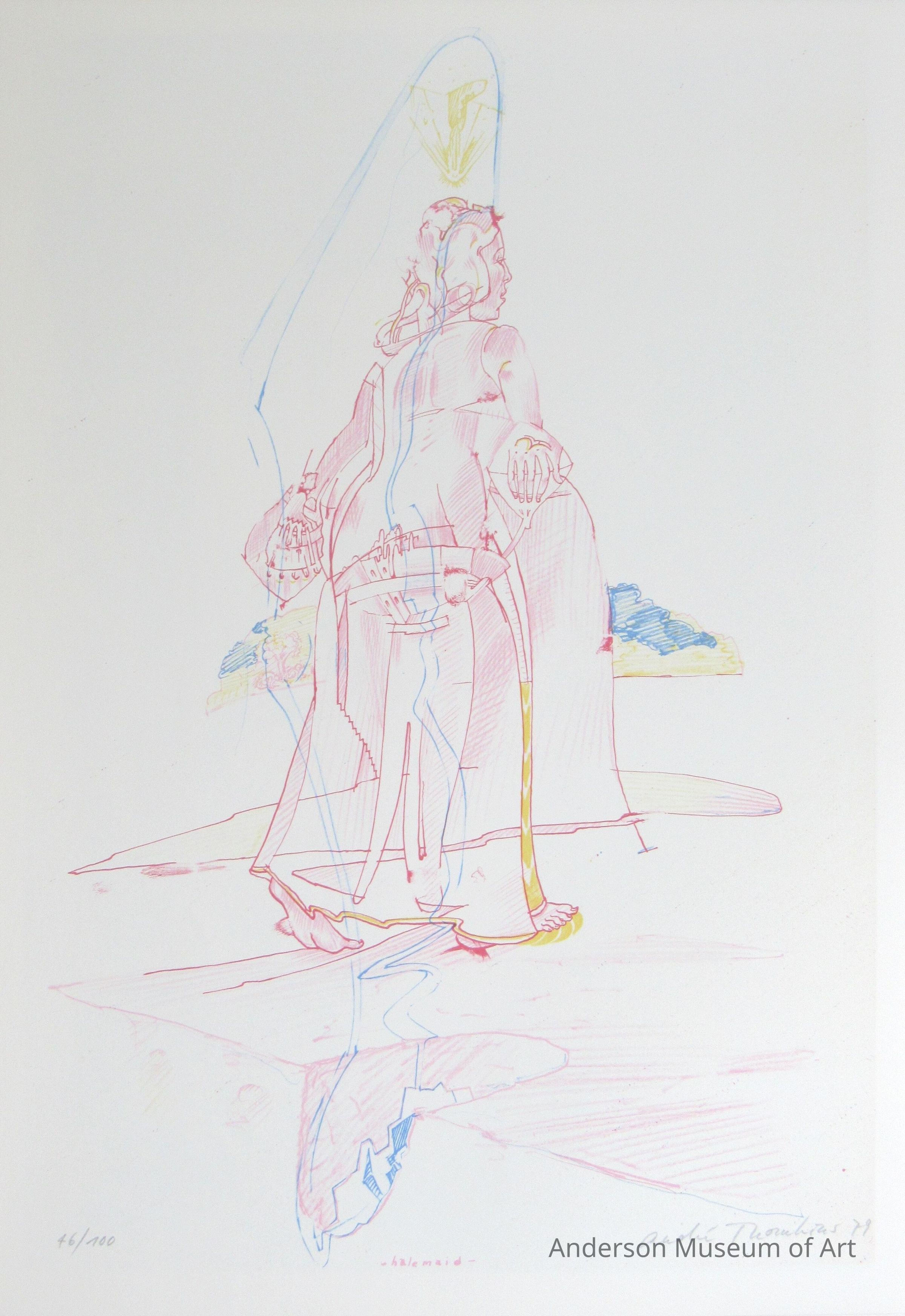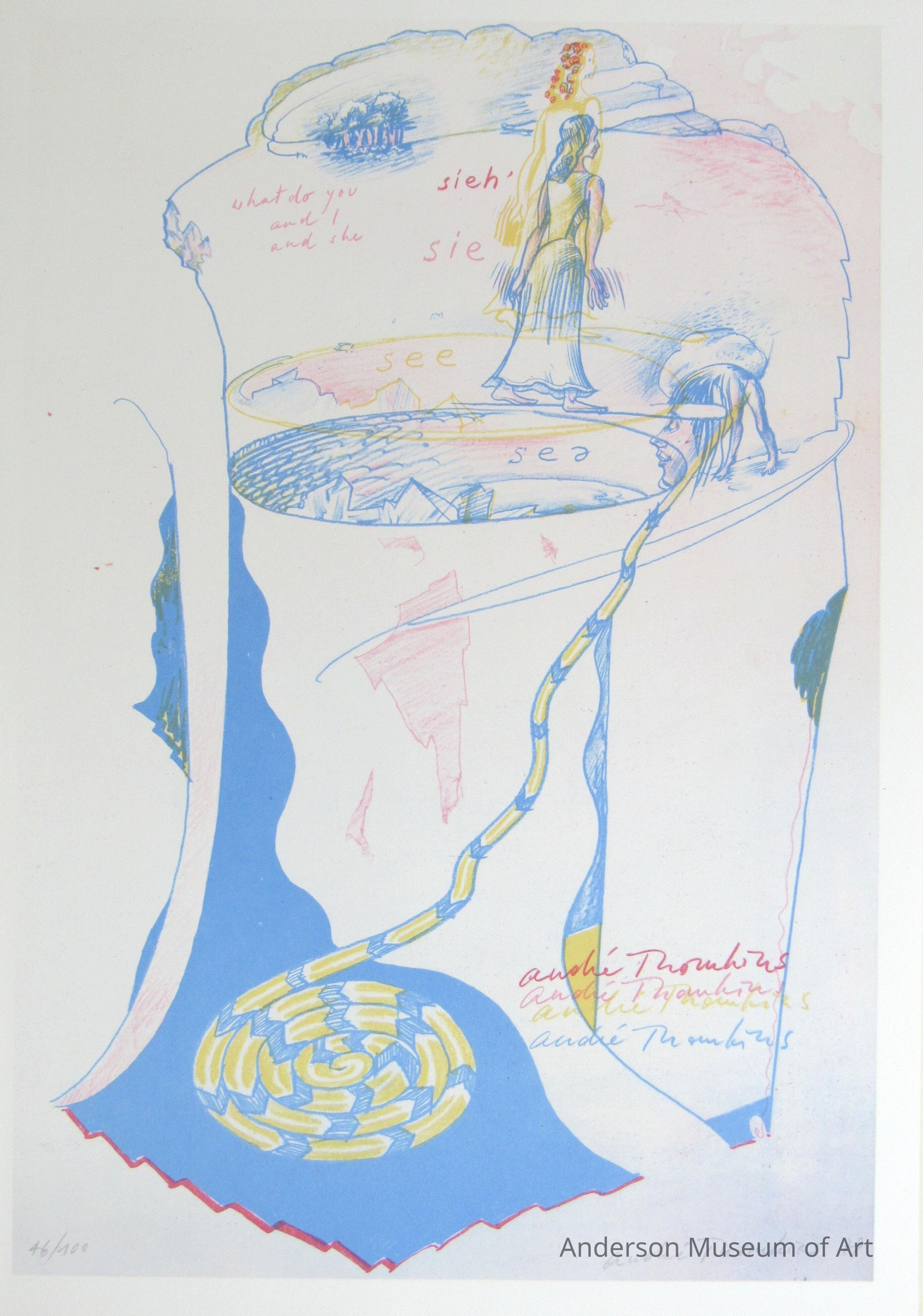 1985.2.2.12 - Abstract color print of a female in a white dress on top of a hill formation. There is a yellow version behind the figure. She is standing near the edge of a hole. To her right is a male face with the coiled snake shape coming from his head. "what do you and I and she" is written in pink to the left of the lady. The words "sieh" and "sie" are also written in pink and red to her left. "sea" is written in blue in the hole and "see" is written in yellow just above it. "Andre Thomkins'"is printed four times in red, pink, yellow, and blue at the bottom right. Color palette limited to the primary colors and pink. Print 46/100. Signed in pencil, BRC, "Andre Thomkins 79". Size: 19.562 x 13.75
