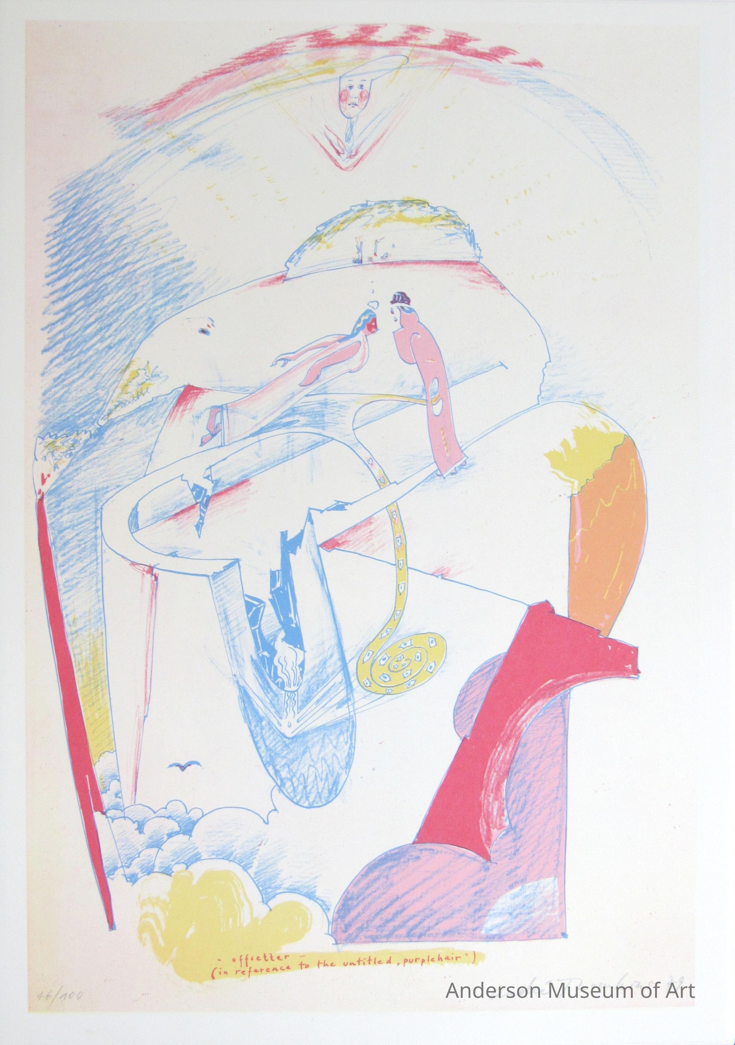 1985.2.2.2 - Abstract color print of a couple in the center in light pink. They are standing on a mountain-like shape. There is a yellow snake shape below the couple and a dome and a face above them. Mostly a primary color palette with some orange and pink. "Offsetter (in reference to the untitled 'purple hair')" printed in red at the bottom. Print 46/100. Signed in pencil, BRC, "Andre Thomkins 79". Size: 19.562 x 13.75