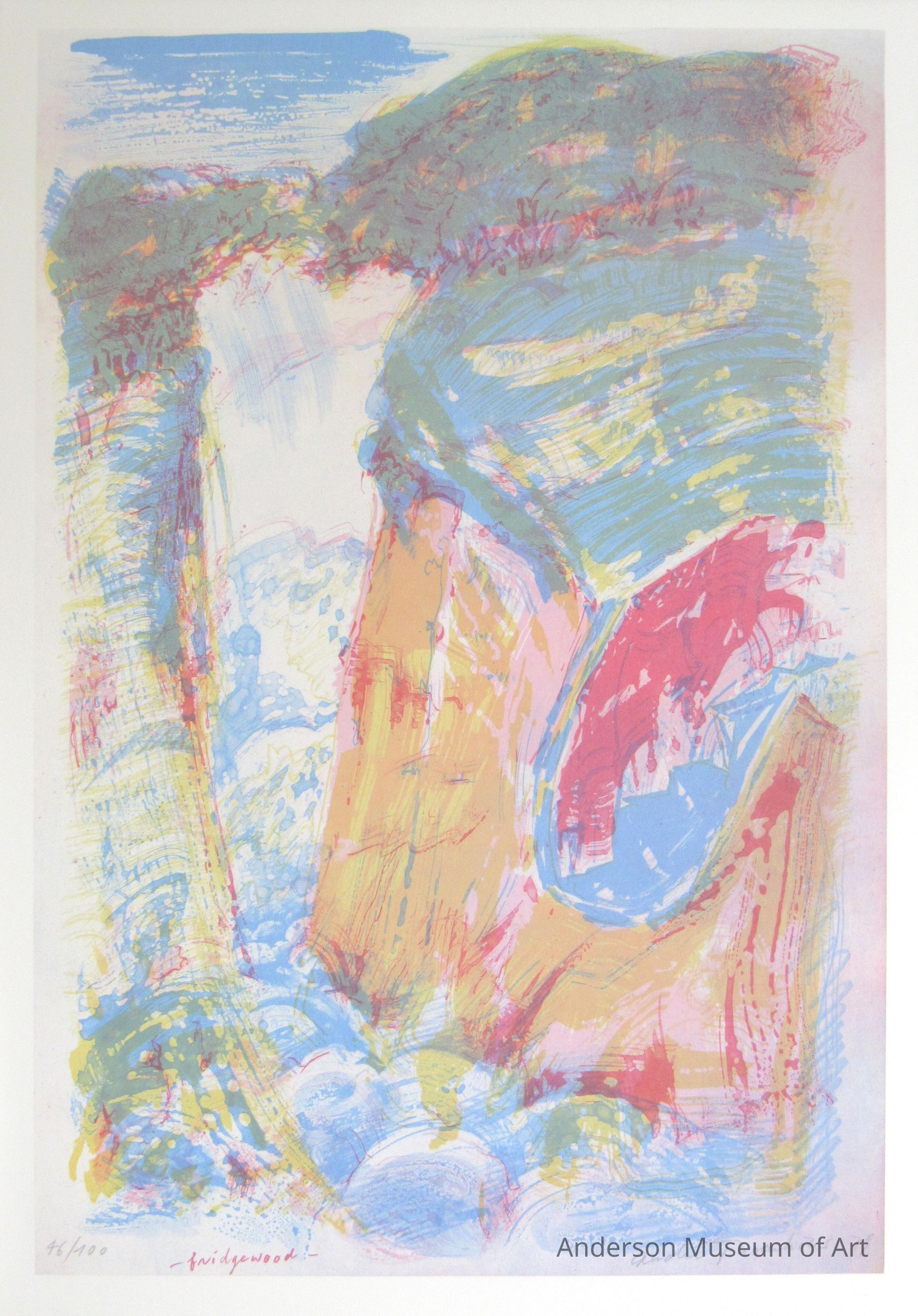 1985.2.2.11 - Abstract color print of a colorful landscape. Appears to be a waterfall starting at the top left and has water flowing down then to the right. It is a very deep gorge with the sides orange and the top colored in green grass. To the right is the repeating cross cut of the small rocky pond. "-fridgewood-" in red at the bottom. Print 46/100. Signed in pencil, BRC, "Andre Thomkins 79". Size: 19.562 x 13.75