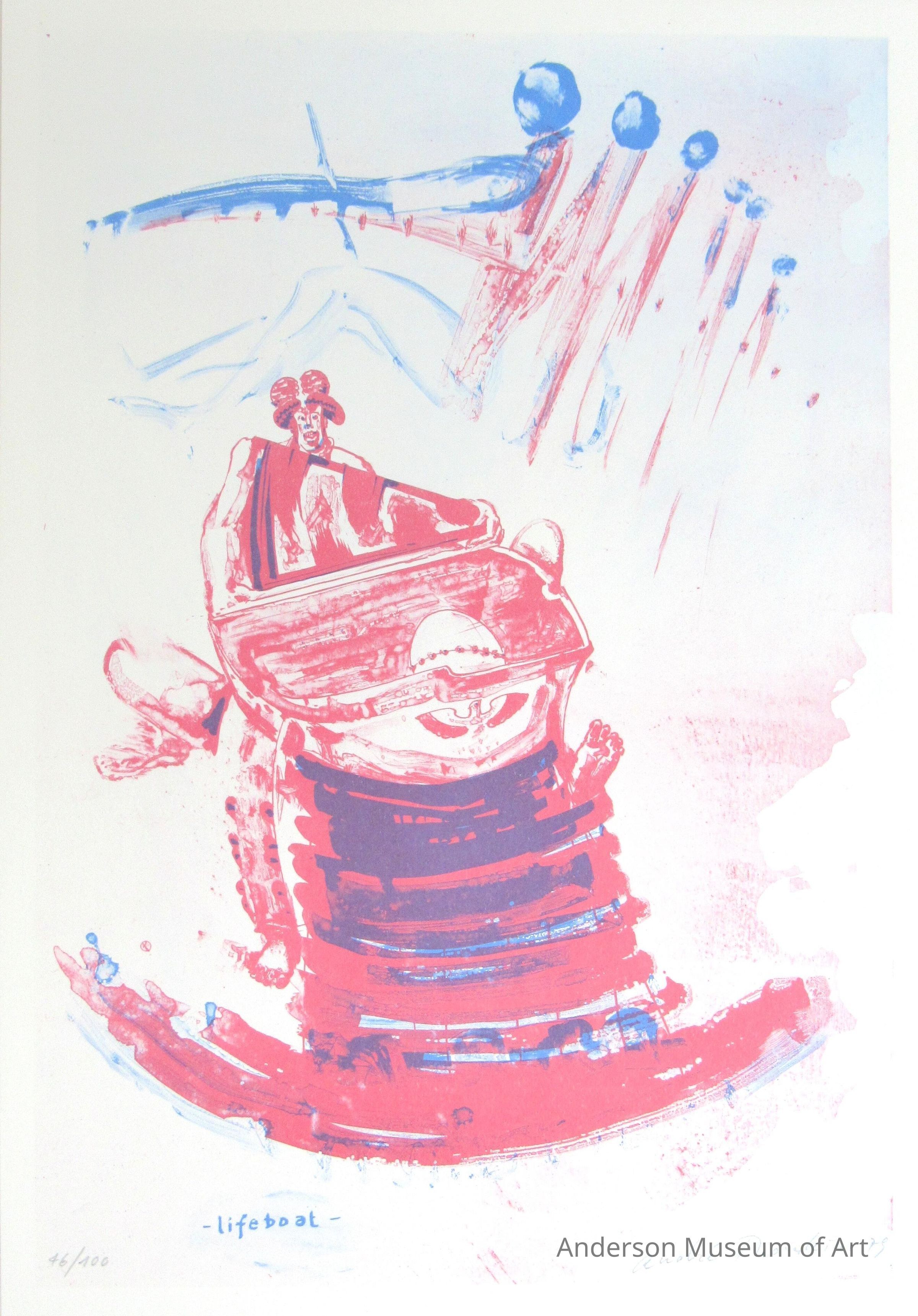 1985.2.2.3 - Abstract color print of a mostly red lifeboat with some blue lines. There is a figure with his head coming out the top. Above him in the sky are some blue circles and some red line brush strokes. "-lifeboat-" written in blue at the bottom. Print 46/100. Signed in pencil, BRC, "Andre Thomkins 79". Size: 19.562 x 13.75