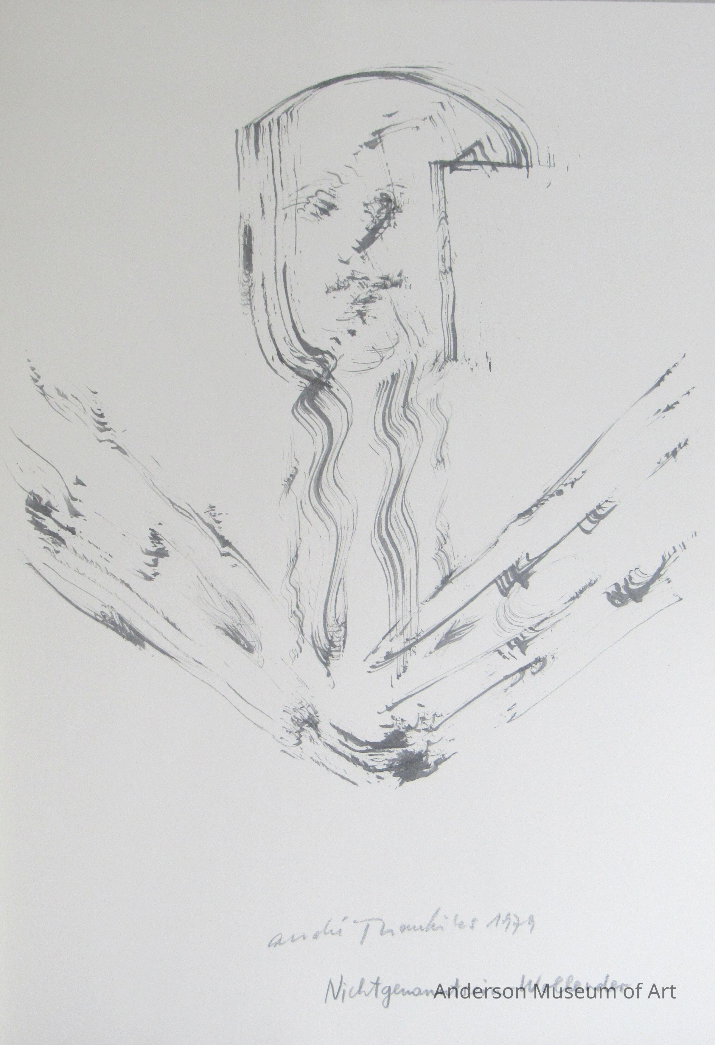 1985.2.2.13 - Abstract print of a face coming from a v shaped piece of wood. Grey color only. Signed in pencil at bottom as well as the title "Nichtgenonntsein-Wollender" possibly translating to "Not in stone -endless". Signed in pencil, BRC, "Andre Thomkins 1979". Size: 19.562 x 13.75Collection
