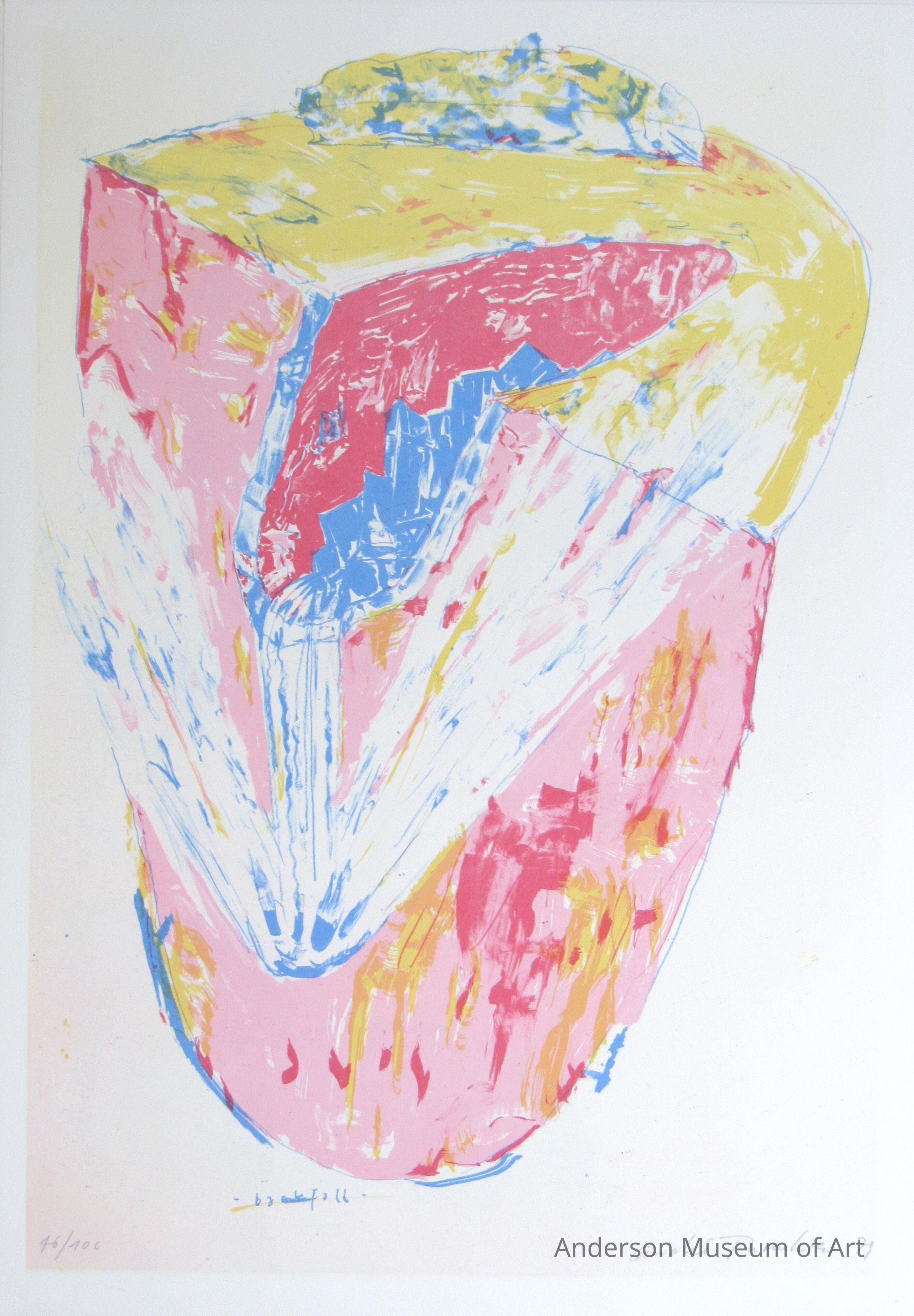 1985.2.2.4 - Abstract color print of a landscape. Oval figure with different cross sections. In the first cross section the top of the shape is yellow with the side all pink. Another small cross section shows that the inside is a darker red with blue. Appears to be a waterfall with white water flowing from the middle cross section and from the yellow top. The color pallet is limited to primary colors with some orange and pink. "-backfall-" written in blue at the bottom. Print 46/100. Signed in pencil, BRC, "Andre Thomkins 79". Size: 19.562 x 13.75