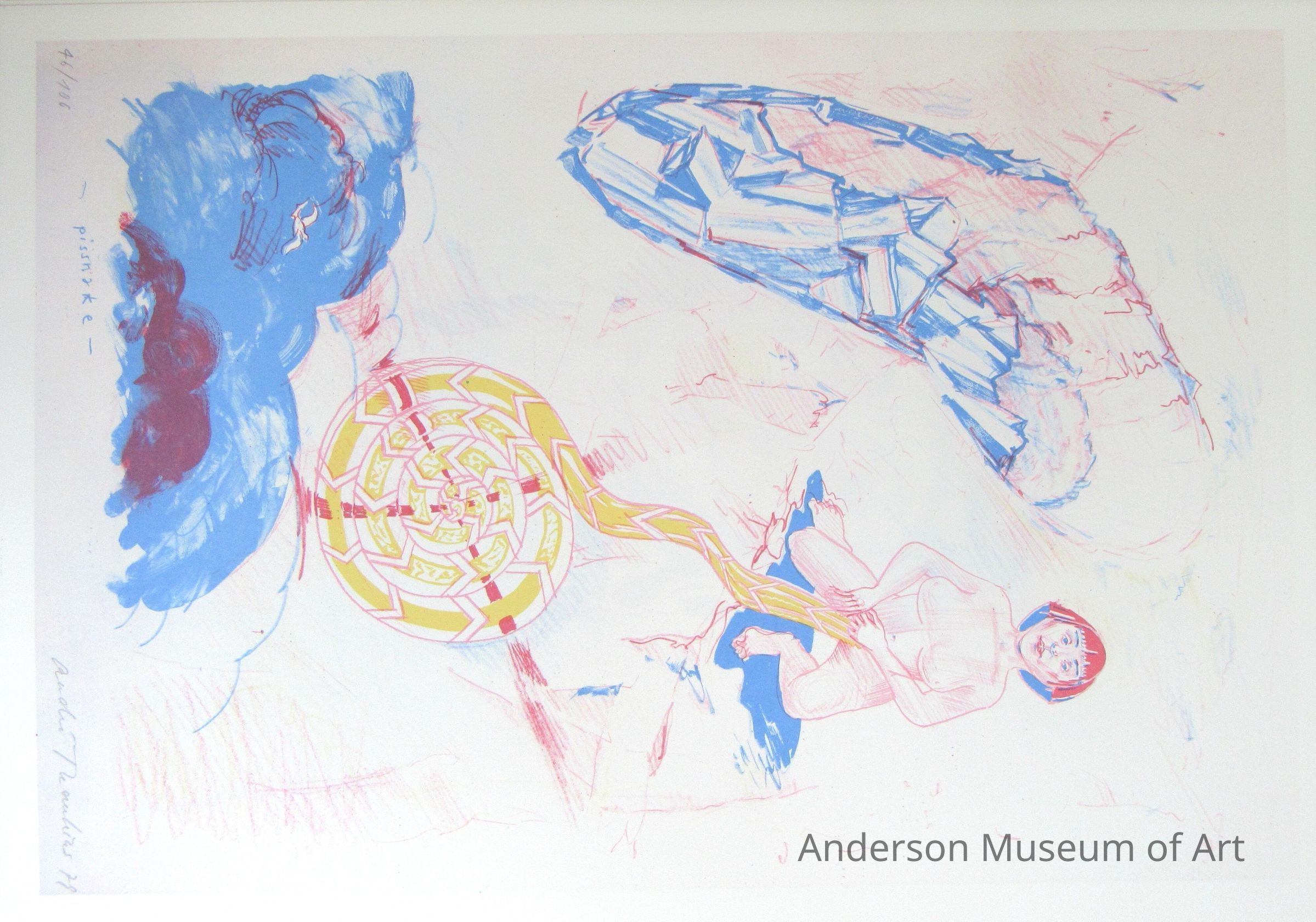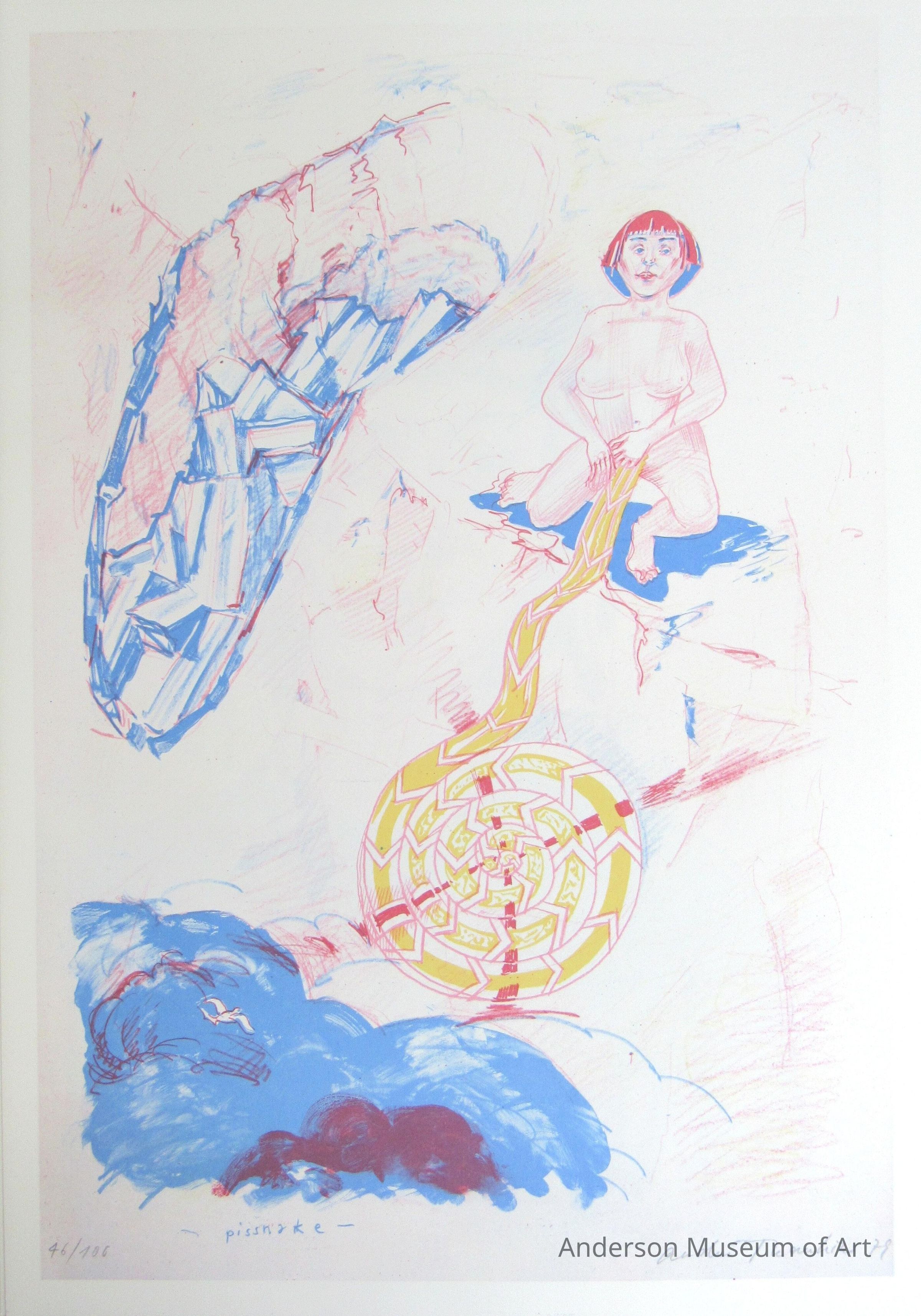 1985.2.2.5 - Abstract color print of a red, nude, woman squatting on a rocky landscape. There is a blue puddle below her and a yellow, spiral, snake shape is connected to her lower area. Below are some blue clouds and a white bird. To her left is a blue crosscut filled with square rock shapes. Color palette limited to primary colors. "-pissnake-" written in blue at the bottom. Print 46/100. Signed in pencil, BRC, "Andre Thomkins 79". Size: 19.562 x 13.75