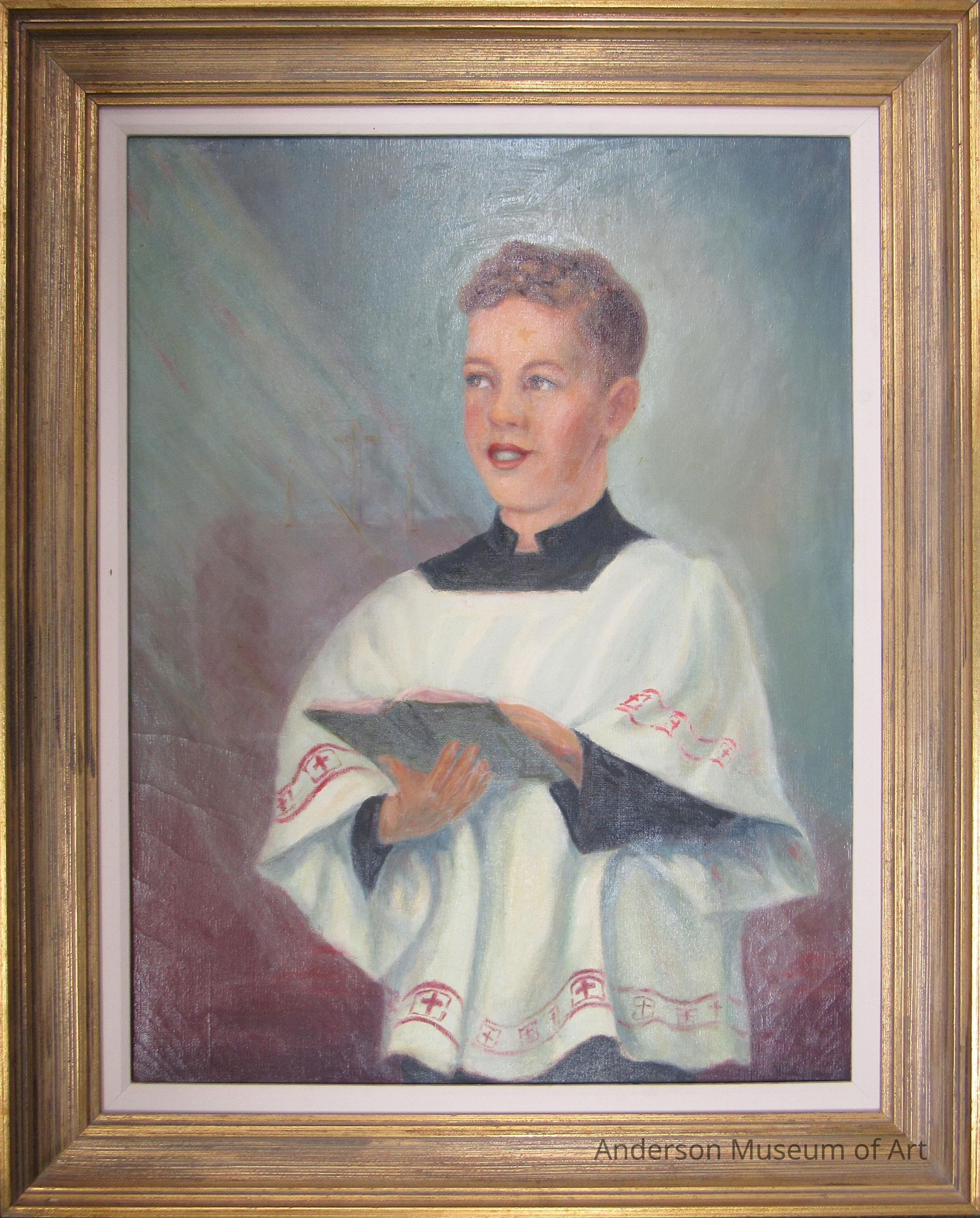 Portrait of a young boy dress as an alter boy. The boy is white with brown eyes and brown, tight, curly hair. He is wearing a surplice with a red plus sign in a red box design around the hem and the edge of the sleeves. Underneath his tunic he is wearing a black shirt. He is standing (painted from the waist up), facing and looking to the left, and holding a bible open in his hands. The background is a mix of blues mostly in the top half and reds in the bottom half. On the left are some directional lines coming in creating a light source shining on the boy. There are some faint yellow crosses in the background to the left of his face. The boy is slightly off center and more to the right of the canvas. Signed "Ben F Scott", vertically and in red along the left bottom side.Type of Painting