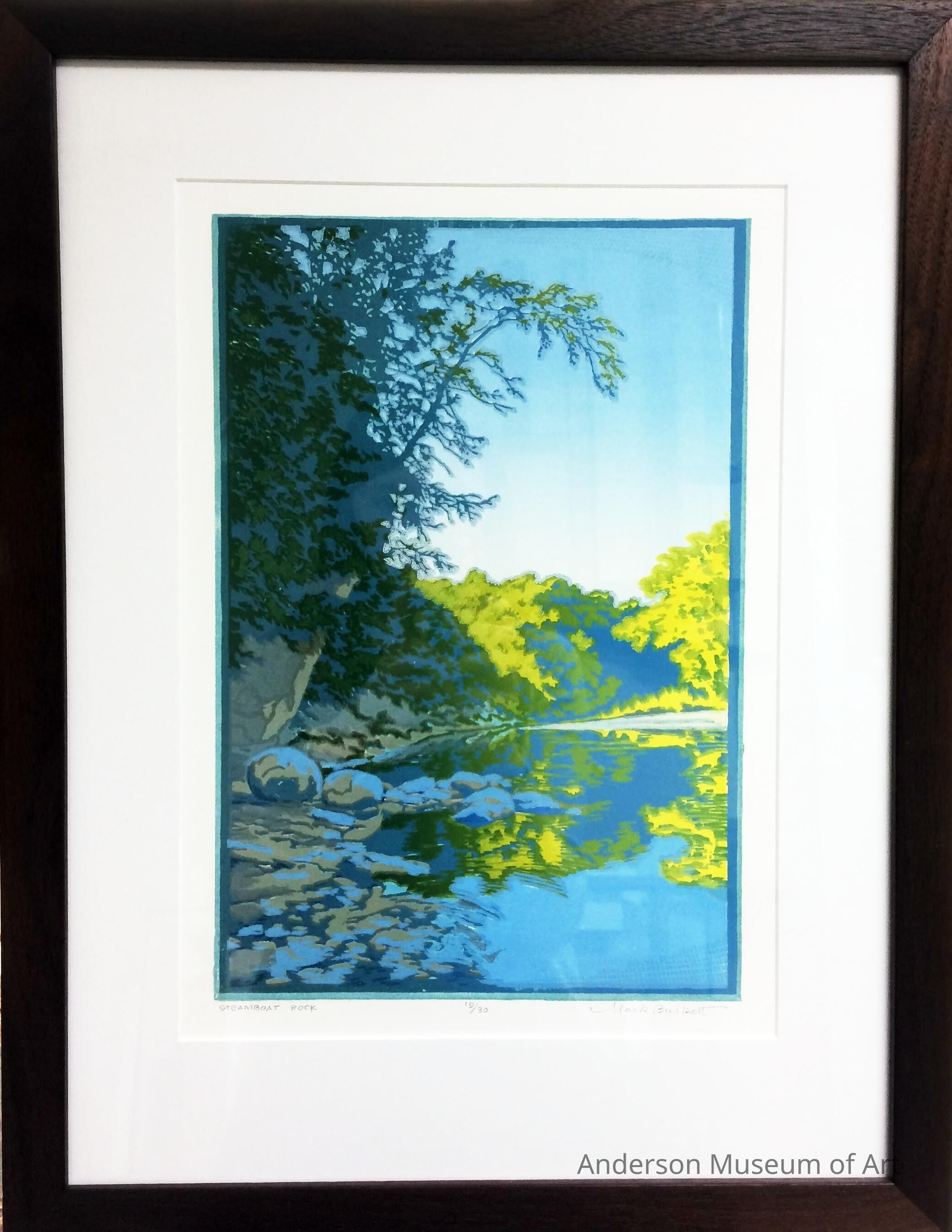 Landscape print. To the left edge is the water's edge with a rocky shore at the bottom and tall trees above. There is a single limb that stretches out over the water. There are bright green trees along the horizon line. The rest of the foreground is of water/lake reflecting the trees. The sky is a clear blue and cloudless. There is a heavy shadow on the trees and rocks in the foreground. Signed "Mark Burkett 19/30. Possible plate colors: yellow-green, green, teal, light blue, dark blue, light gray, dark gray, and a creme.Collection