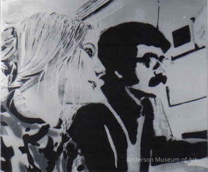Print 4/15. Two figures dominate. The woman is in front with light color hair that is pulled back into a bun with a few loose strands of hair sticking out. Her head is titled to the side, and a man with dark medium length hair, sideburns, a mustache, and sunglasses is behind her. Both are facing right. The work is signed "Rollman" in the lower right corner.Collection