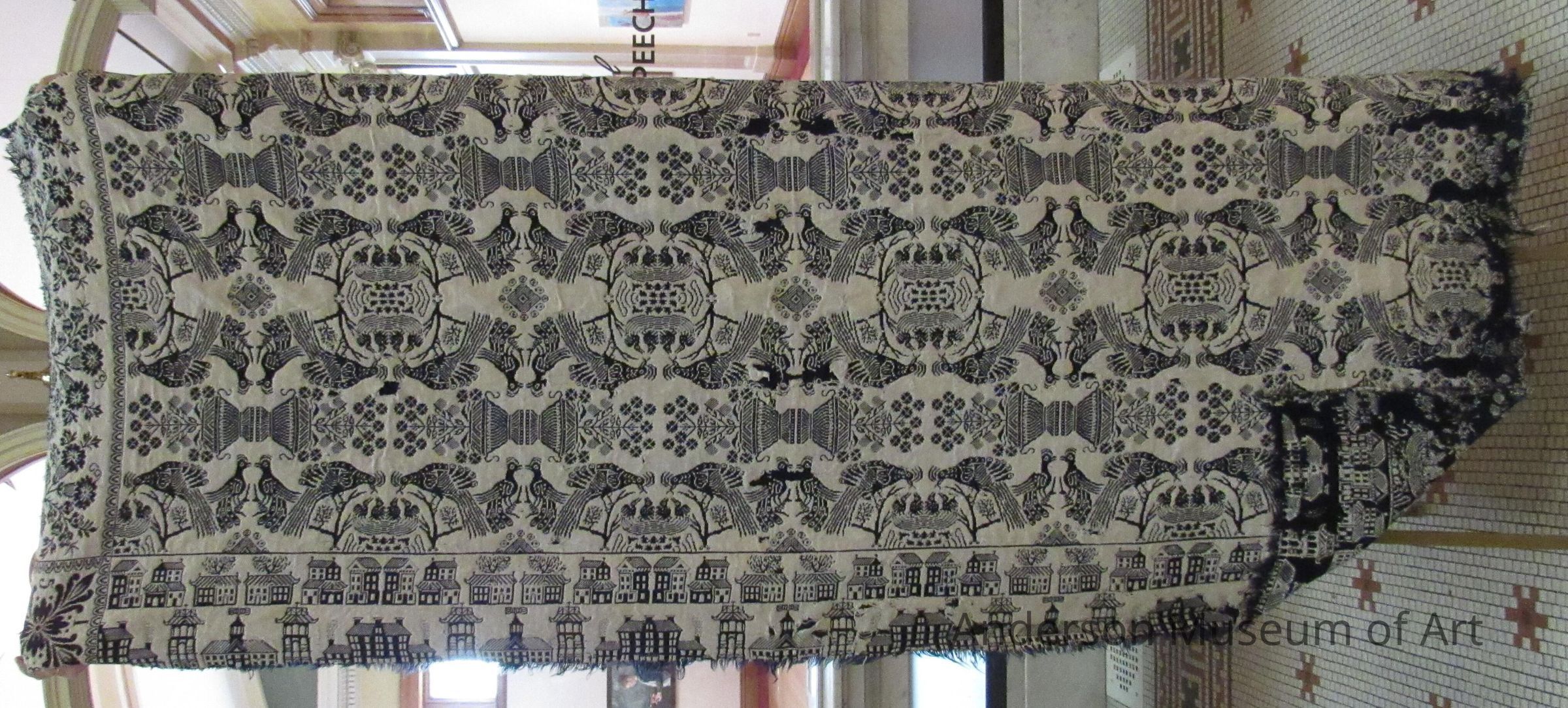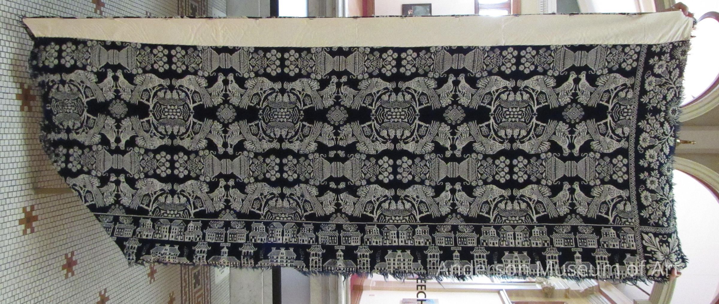Hand-spun wool; hand-woven coverlet. In the corner has the date "1805." Around the edges are houses and in the center are numerous birds. Some of the mother birds are feeding baby birds. Colors are dark blue and white.Acquisition