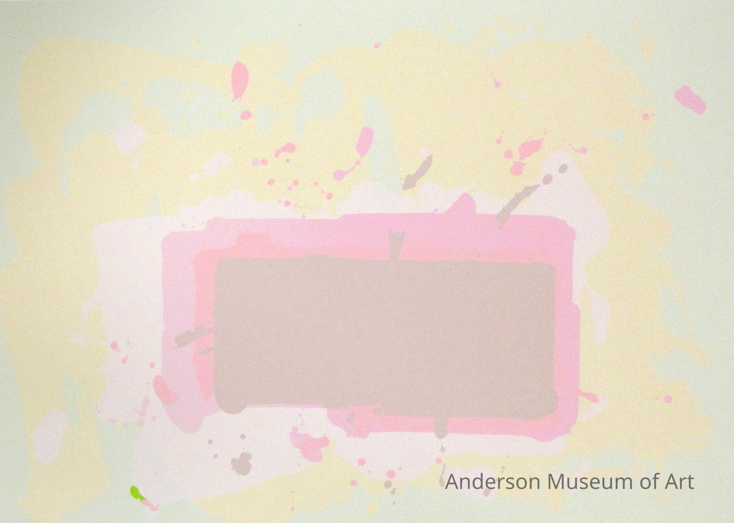 Light green background with a large yellow rectangle covering most of the green. There are three layered rectangles in the center starting with a purplish pink on bottom, then another shade of pink, and then brown on top. The pinks and browns also splatter outward as though they were paint. Signed bottom right "John Hoyland 71". This print is 31/100.Collection