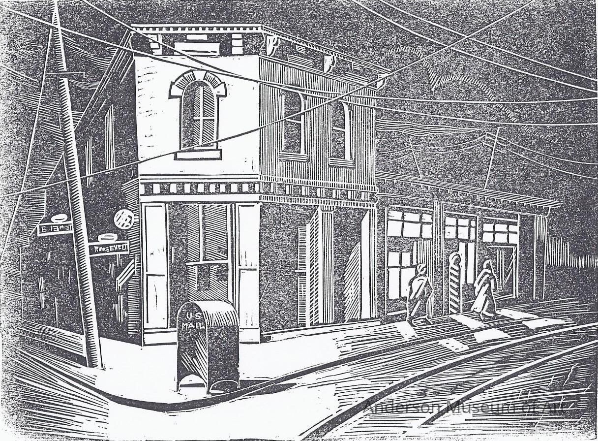 The image is an urban scene, a street corner at night. There is a street in the foreground with railroad tracks and a U.S. Mail drop box in LL. There is a building at the corner of E 13th street and Roosevelt which appears to be Victorian architecture with large and graceless soffits and braces beneath the roof overhang. To the right of the main building is an attached building that appears to be a barber with a pole out front. There are two people walking in front of the barber store. The telephone pole leans precariously over the street in LL and extends into UL. Written in pencil below image "13th & Roosevelt, Indpls."Acquisition