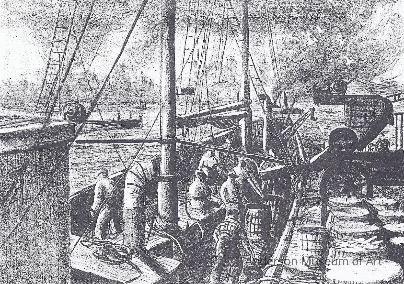 Industrial seaport scene of some sort of ship, possibly a fishing vessel, that seems to be docked and may be preparing to load or unload. On the ship, there are eight men, seven standing and one seated. In the distance, a skyline of a city can be seen. Over the vessel and slightly to its right fly seven gulls; another gull is flying to the left of the ship. In the waters surrounding the ship, there are a number of other boats of varying sizes. In the left foreground, there is a wooden cabin of the ship that the men are standing on. Several lines are tied to it and group into the upper riggings.Acquisition