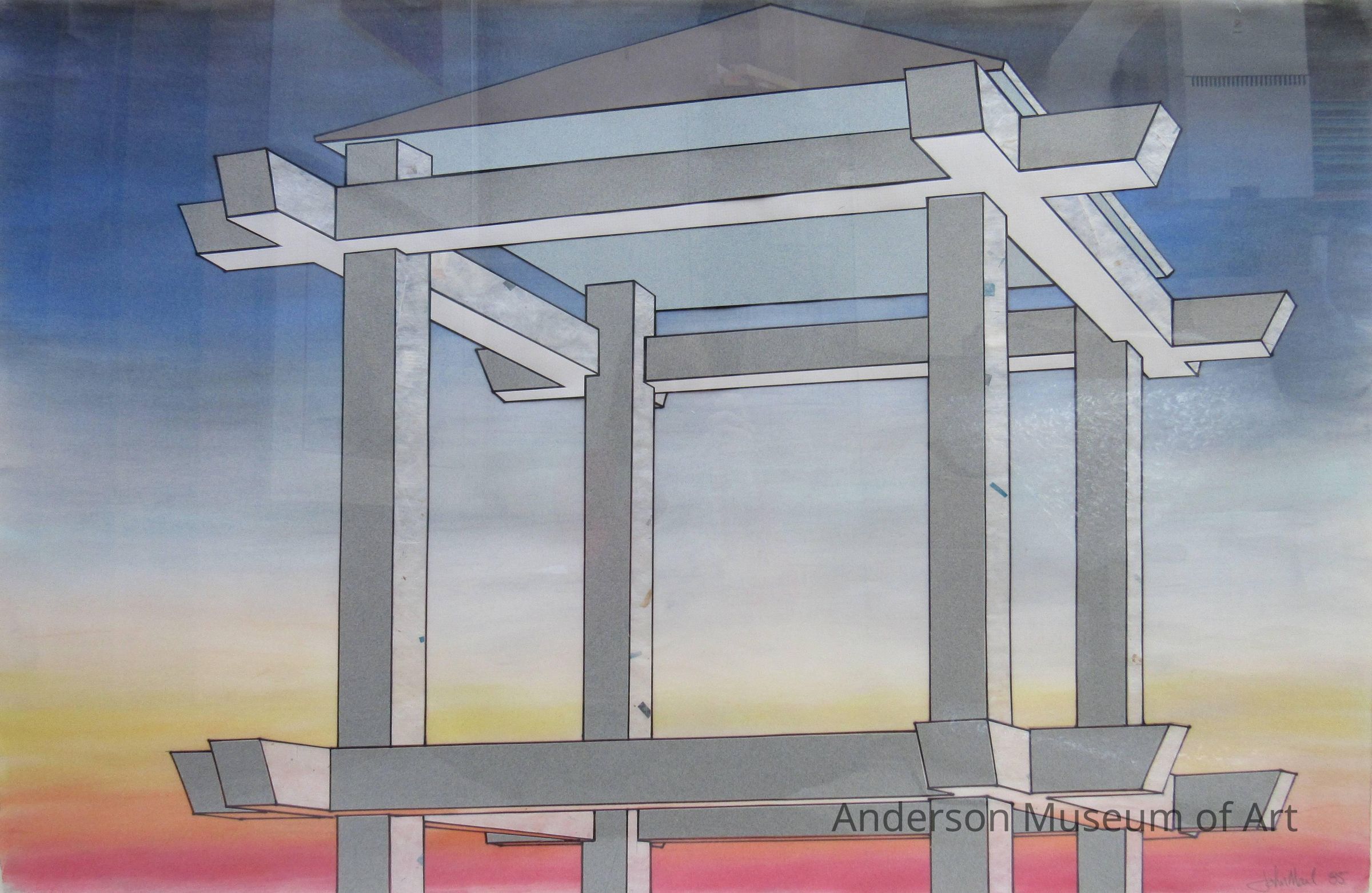 Grey structure resembling an open framed cube. Each piece sticks out a little beyond the corner. There is a flat piece on the top like a roof. The background fades from blue at the top, to yellow, to red. Foreground image that of an architectural monument of some sort, somewhat reminiscent of a Buddhist shrine. The structure is outlined with felt-tipped marker ink and the lines are filled in with cut papers of white and grey.Collection