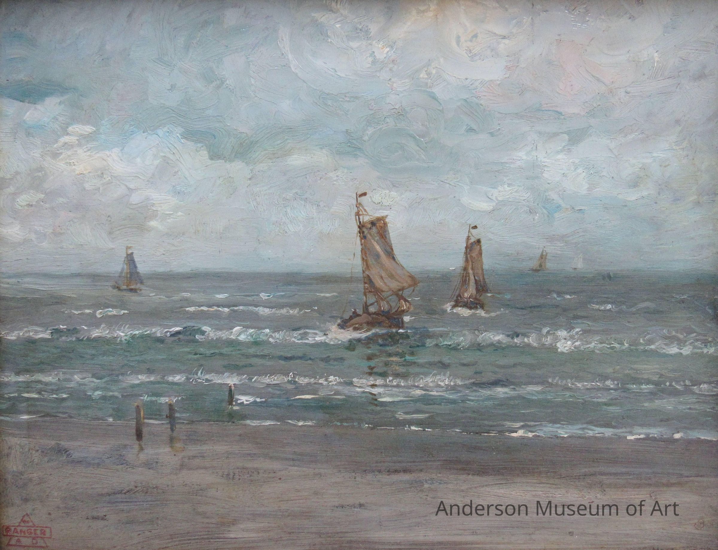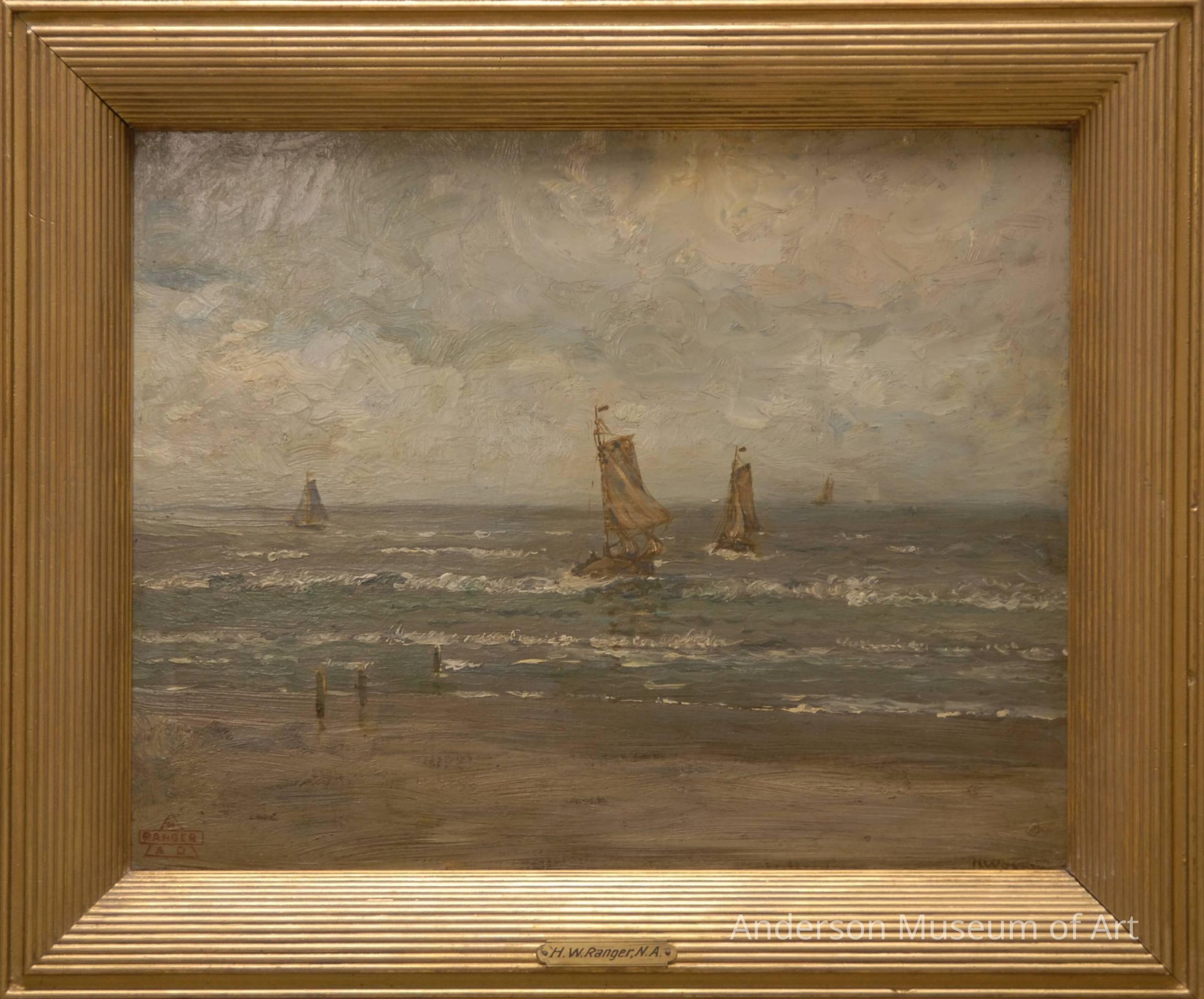 Oil on academy board, the image of four ships sailing in the ocean a few heading to the shore line, signed in the lower right corner "H. W. Ranger."
