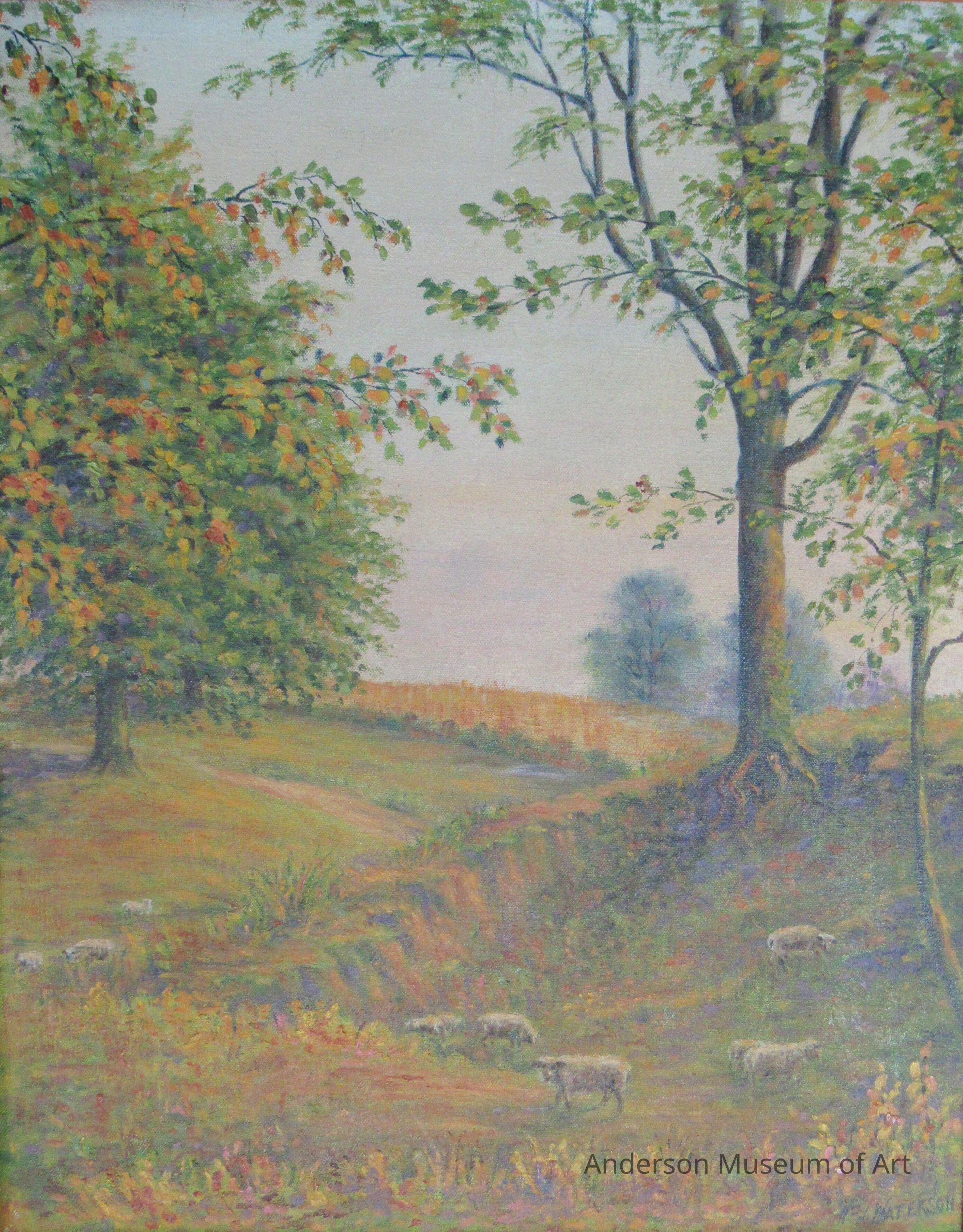 Possibly part of a diptych ( with 1981.5.3). If so, this is the left side. There is a large tree on the left as well as two on the right. In the foreground, there are six grazing sheep in a hilly pasture. The painting has a limited palette consisting of greens, yellows, whites, and browns.Type of Painting