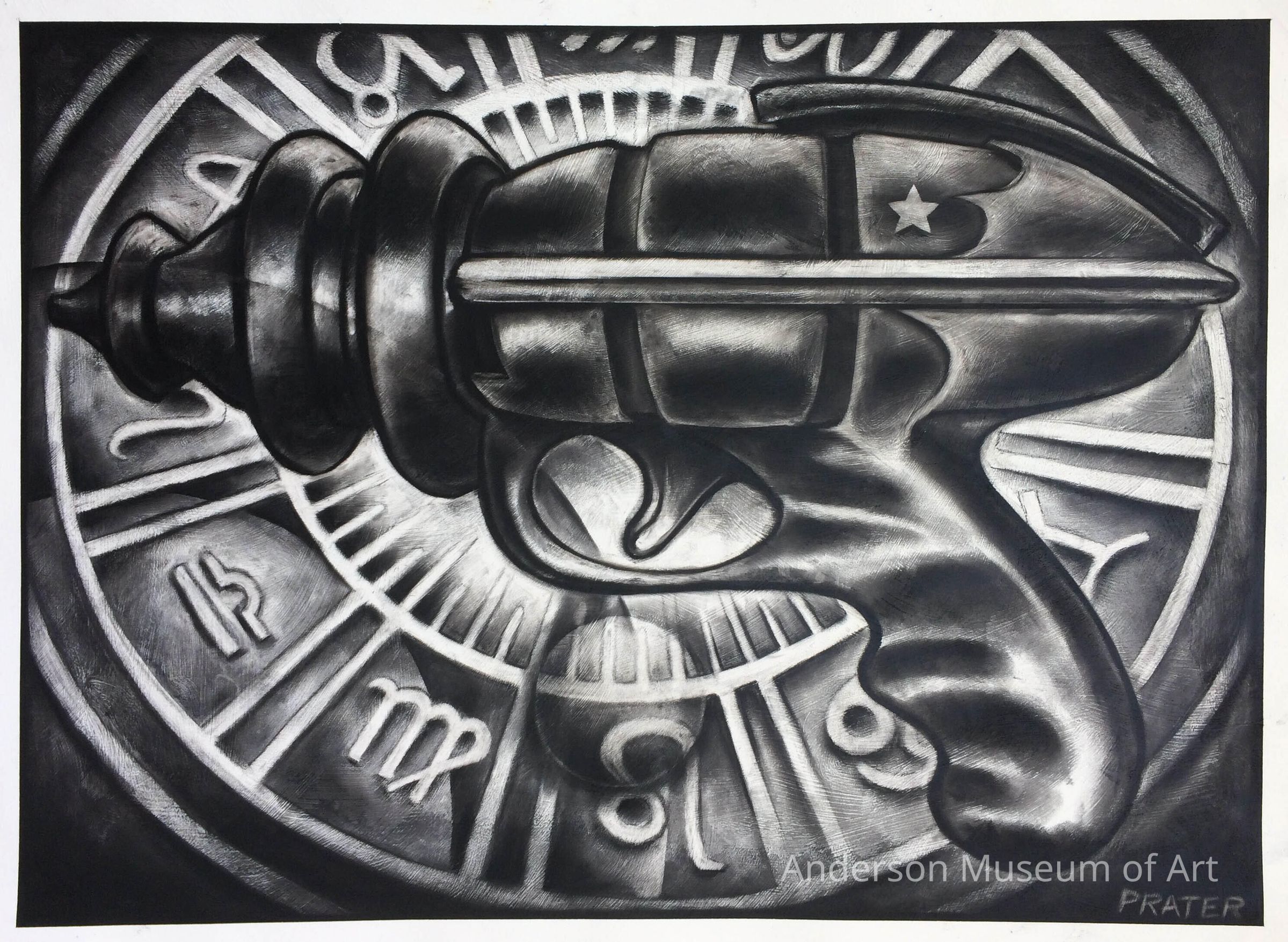 Black and white drawing of a raygun. We see a side shot of the raygun, which takes up most of the image, almost touching each edge. The gun is point towards the left. There is a small white star on the back of the gun. In the background, there is a circular, dial shape with white zodiac signs starting with cancer near the handle and moving clockwise: Leo, Virgo, Libra, and so on. Just below the trigger is a circular area that has a magnifying effect. Signed "PRATER" in the bottom right corner in white. The primed paper is obvious and gives the whole piece a painterly, or brush-like, feel.Type of Drawing