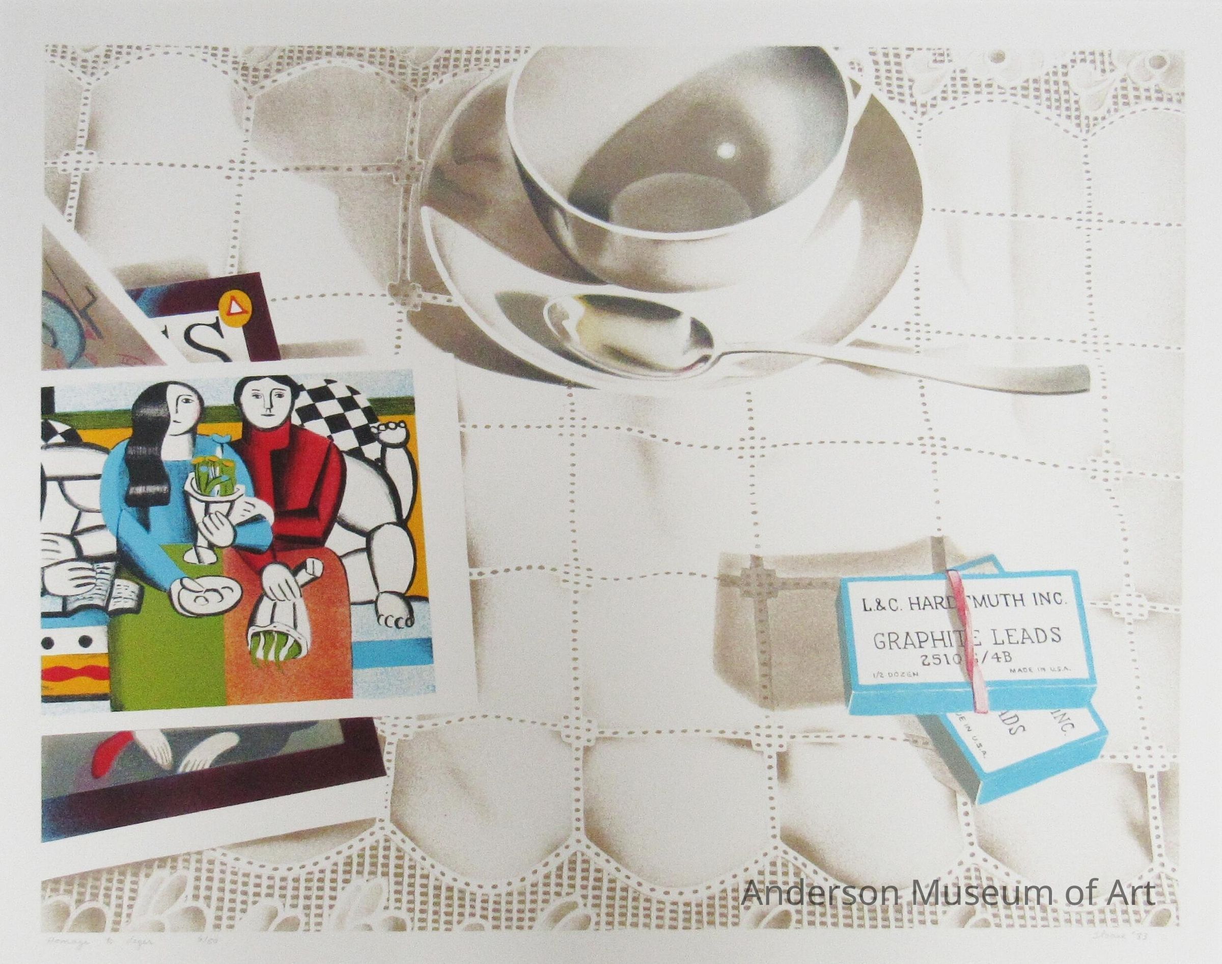Primary foreground images consist of a teacup, spoon, and saucer (UC), a stack of three, what appears to be, color photos or postcards (LC), and two boxes, small and blue (LR). Boxes are stacked on one another. The top box is closed with a red rubber band, In black lettering on the box appears written "L.& C. Hardtmuth Inc., Graphite Leads, 25105/4B, 1/2 Doze, Made in U.S.A." The background consists of a lacy tablecloth in varying shades of white and brown. Beneath the picture is written LL, "Homage to Leger 6/50." LR beneath the picture is written "Sloane '83." Both are written in graphite. Below and two the right of the artist's signature appears the paper manufacturer's watermark which is a raised hand that appears to be waving inside a raised box.Collection