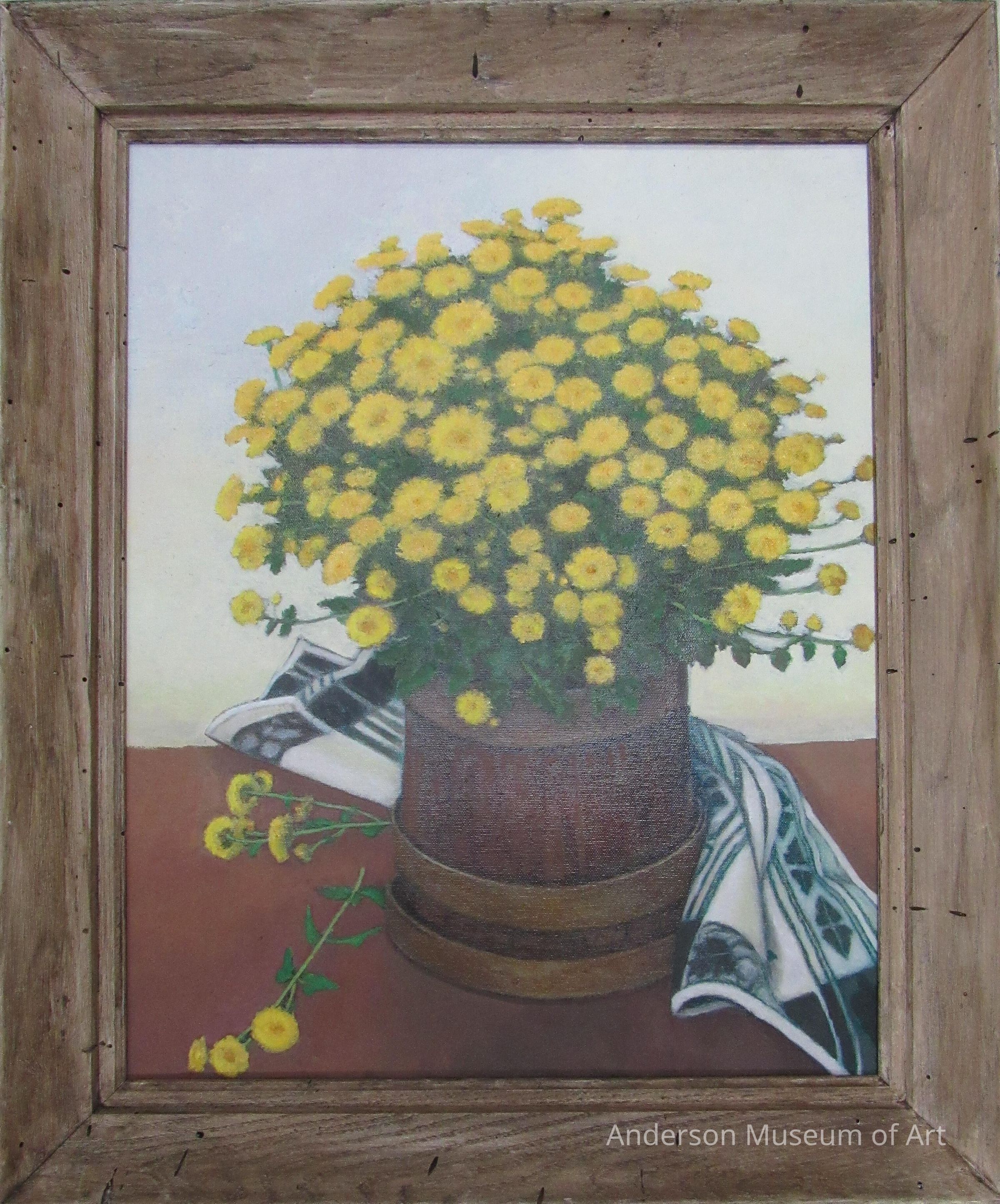 Still life of a yellow mum in a wooden pot. The mum is very bright and fresh looking. The wooden pot is made to look like a barrel with two horizontal bands at the bottom. To the left of the mum, on the brown table, are two cut stems each with a couple of yellow flowers. To the right is a black and white towel with teal highlights. The towel has some stripes and leaf like patterns. The background fades from a light yellow to a light blue in the upper left corner.Type of Painting