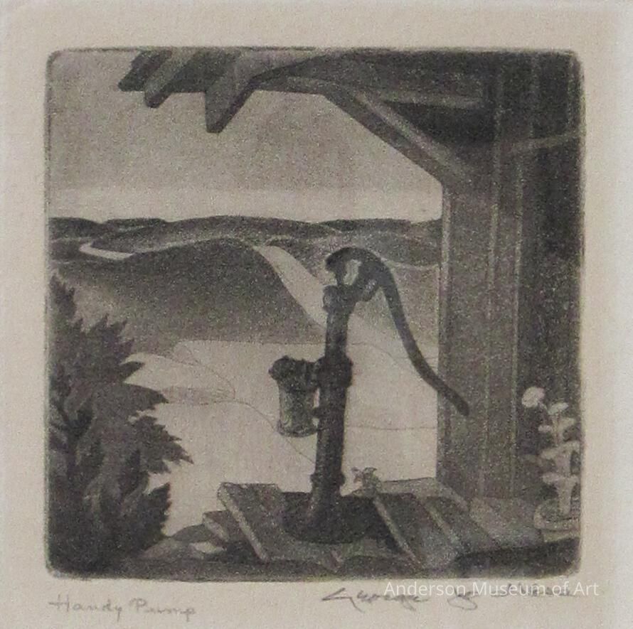 Etching and aquatint in black ink on off-white paper; signed "George Jo Mess" in pencil below the image to the right, titled "Handy Pump" in pencil below the image in the lower left corner. Image depicts a hand pump on the porch of a building, the porch floor has broken boards. To the right and above the pump is a doorway to the building and an overhanging roof. In the lower right corner of the image is a potted flowering plant. To the left of the pump are bushes. In the middle ground are hills with a road winding through them which extends into the background, with sky above.
