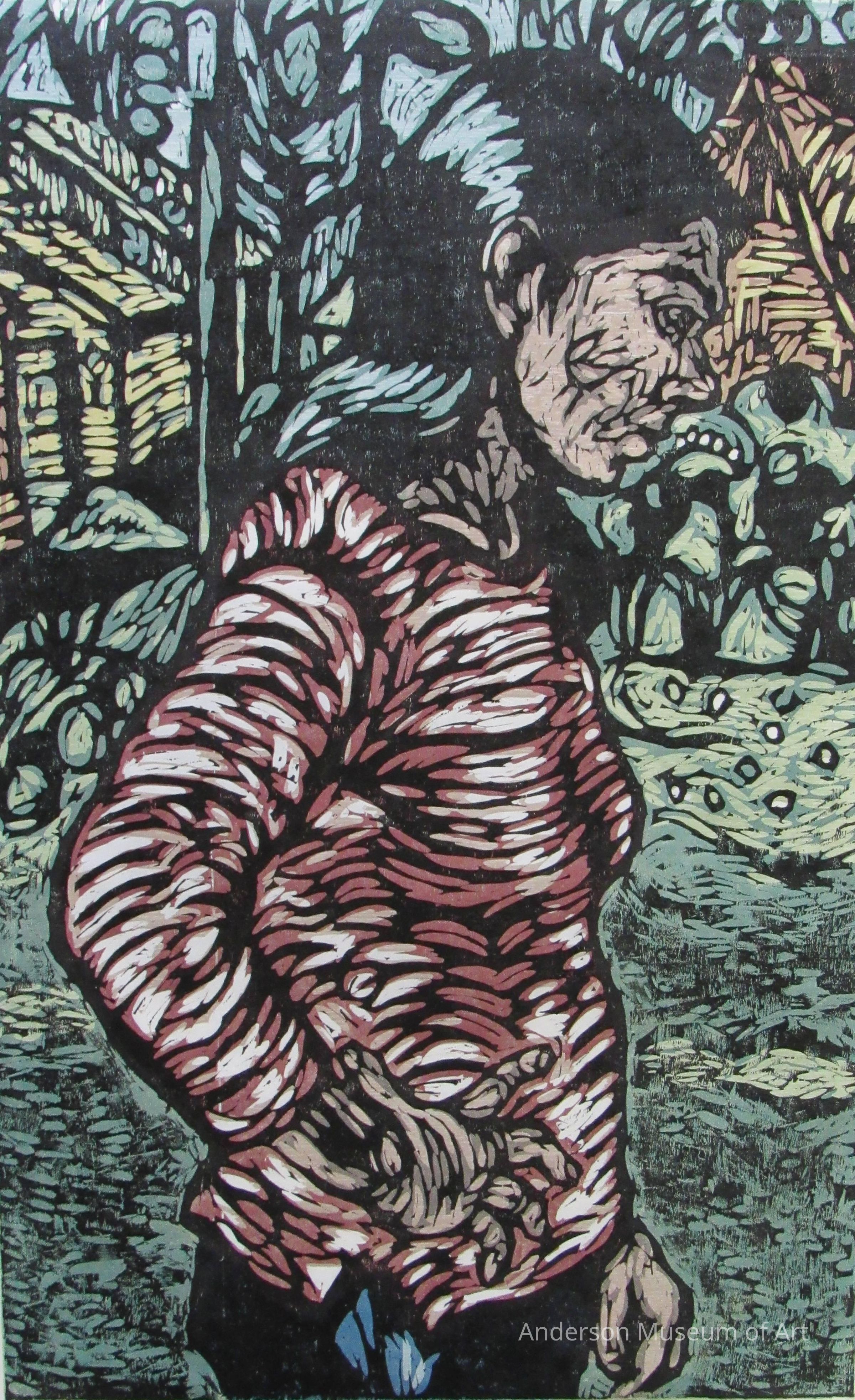 Central image that of a female seen from hips up, standing in the foreground of the picture with one hand on the hip, staring away to the right side of the picture plane. The background appears to be a heavily forested area with a house in the UL. Female predominates. She is wearing blue/black pants and a brown/beige/white long sleeve blouse. Her hair is black and long with touches of blue and green. Female's flesh tones are in beiges, greys, and whites. She appears to be standing on a mowed, grassy area of the ground; heavier vegetation seems to take over in the background. In the far background behind her neck and head, there appears to be a house and there also appears to be a house located in the far background in front of her head. Print 4/5.Collection