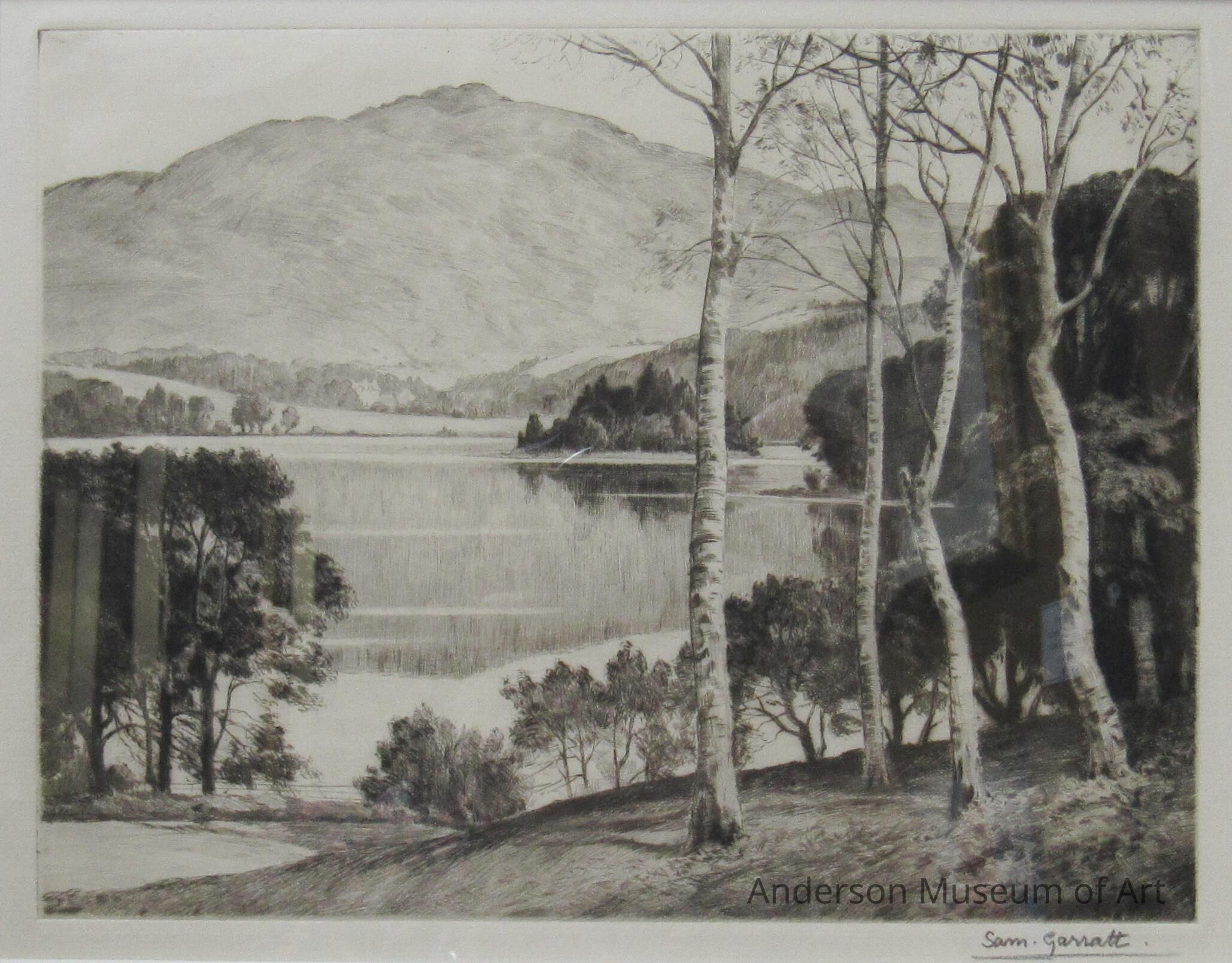 Drypoint etching in warm black ink on white textured paper bearing the watermark "F.J. Head & Co." depicting a landscape with lake. In the foreground are four narrow-trunked trees on the right side. In the middle ground are numerous trees along the shore of a lake. An island with trees is in the lake and beyond is a tree-lined shore with a large mountain behind, which is reflected in the lake. Above is a cloudless sky. The print is signed in pencil below the image to the right reads, "Sam Garratt."