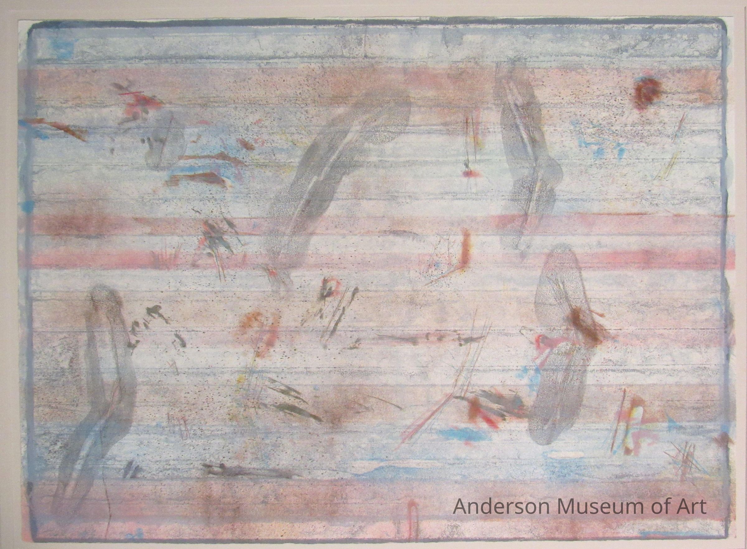 Non-objective image of biomorphic shapes that appear to be afloat in a field of horizontally oriented color stripes of red, white, blue and gray delineated by darker gray streaks. Images appear as smears that are primarily oriented on a vertical plane; some are large while others appears to be little more than scratches. Written in the lower left in pencil, "Trial Proof." In the lower center is written "Foolish Pleasure," and in the lower right written in pencil is "Dan Socha 1978." The outer perimeter of the picture plane is composed of a dark gray rectangular form with rounded corners. Paper appears to be of good quality but bears no watermarks.Collection