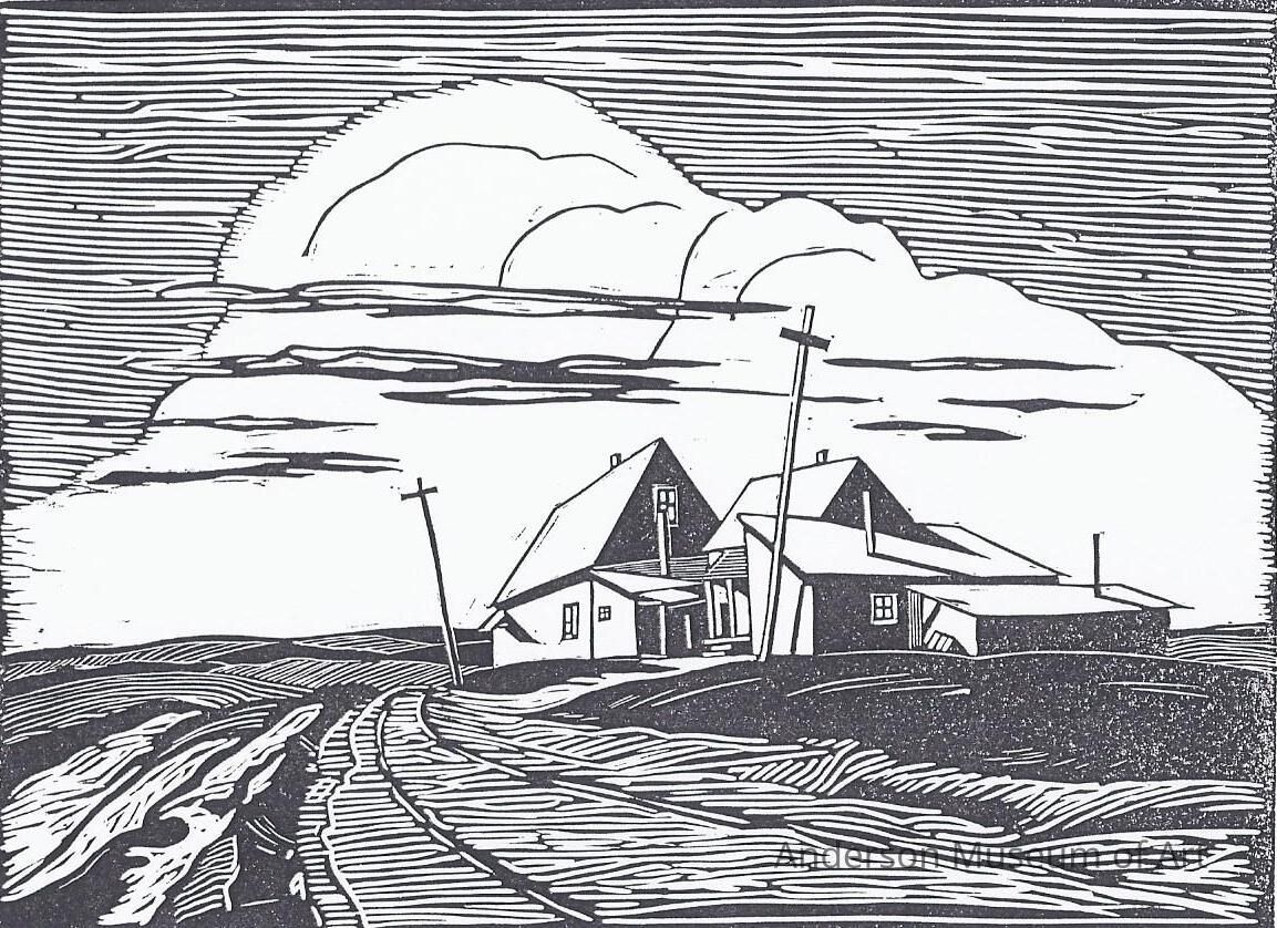 Crisp image of a rural farm scene. Appears to be a rear view of the farm seen in 89.6.5. The land surrounding the farm is rolling farmland, typical in American Midwest. There appears to be a road (possibly a railroad) that begins one-third of the way across the lower picture plane and extends to the far right-hand corner. Its vanishing point is approx. one-third of the waymup the picture from the bottom and approx one-third of the way across the picture plane, beginning from the lefthand side. There is an enormous cloud in the distance, looming over the horizon. The farmhouse and what appear to be two out buildings are in the foreground in the lower right quarter of the picture. As in 89.6.5, the farm building shares its space with two telephone poles, the one on the left-leaning left and the one on the right-leaning right.Acquisition