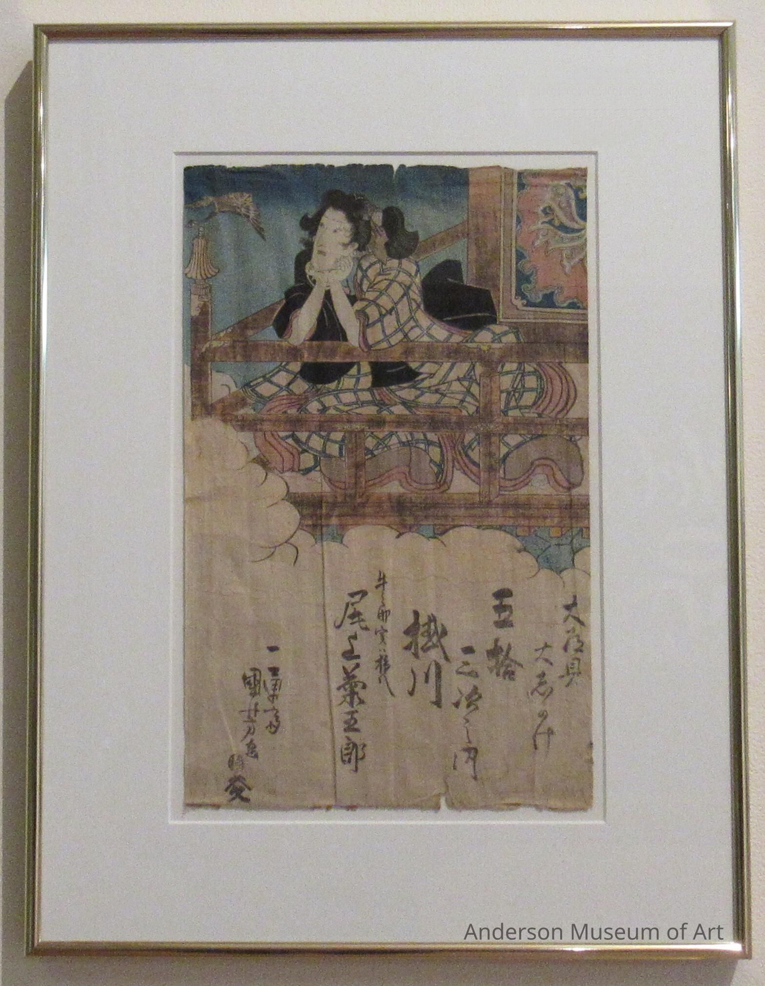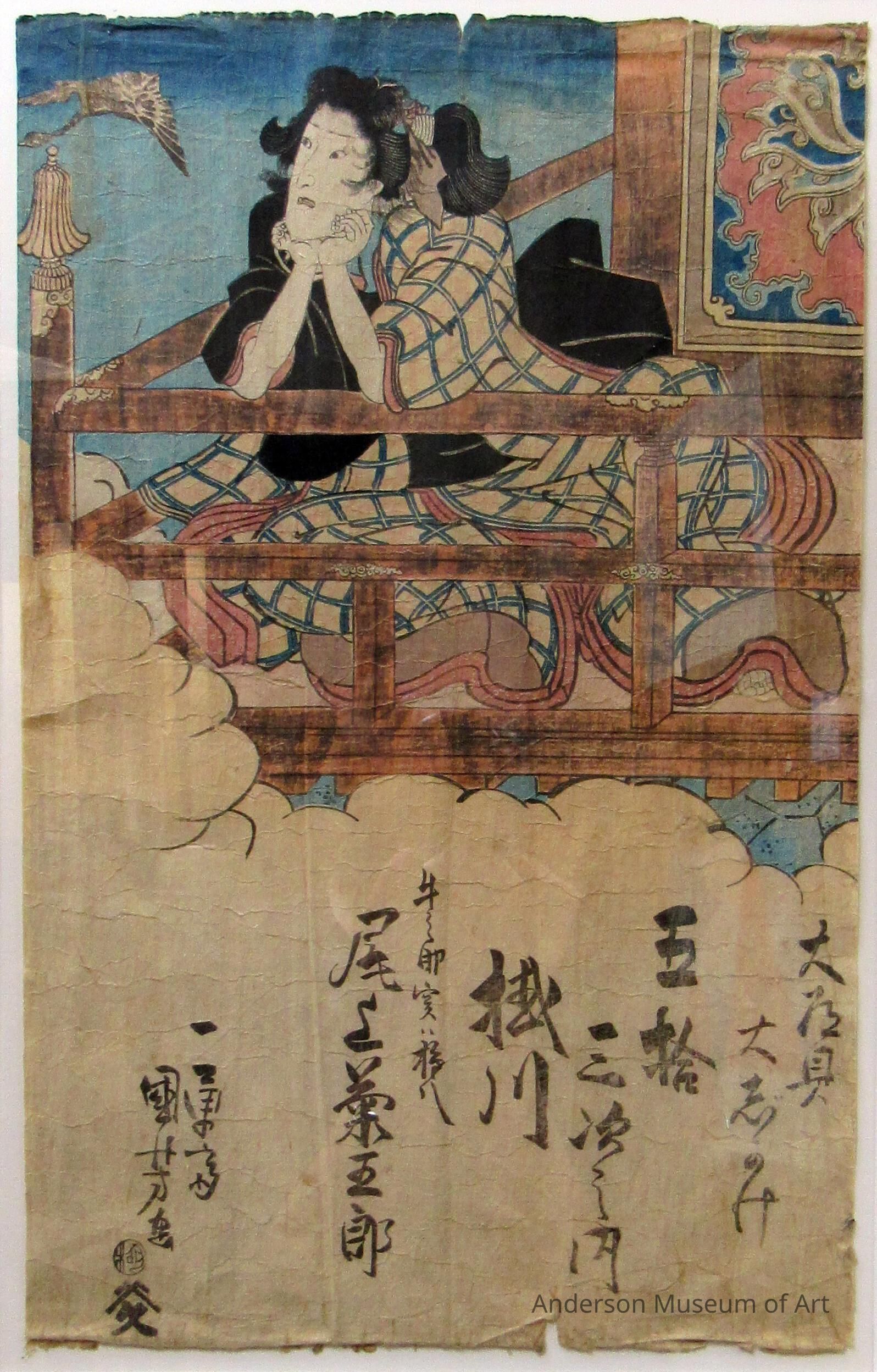 Email from William Pearl "Your print shows kabuki actor Onoe Kikugorô III in the role of Shirai Gonpachi. The kabuki play is 'Ume no hatsuharu gojûsan tsugi' ('Plum Spring: The Fifty-three Stations'). The date is 2nd month of 1835, the publisher is Yamamoto-ya Heikichi, and it was performed in the Ichimura theater in Edo (now Tokyo). This print was originally part of a diptych, or possibly a triptych. I am attaching an image of 2 sheets."Acquisition