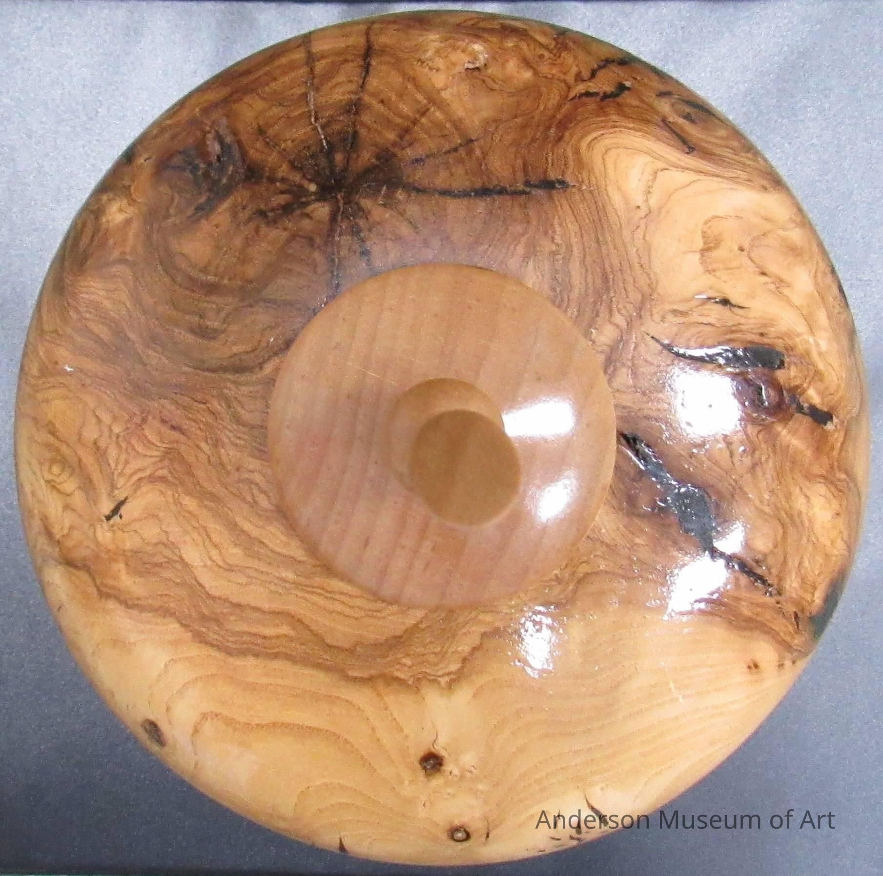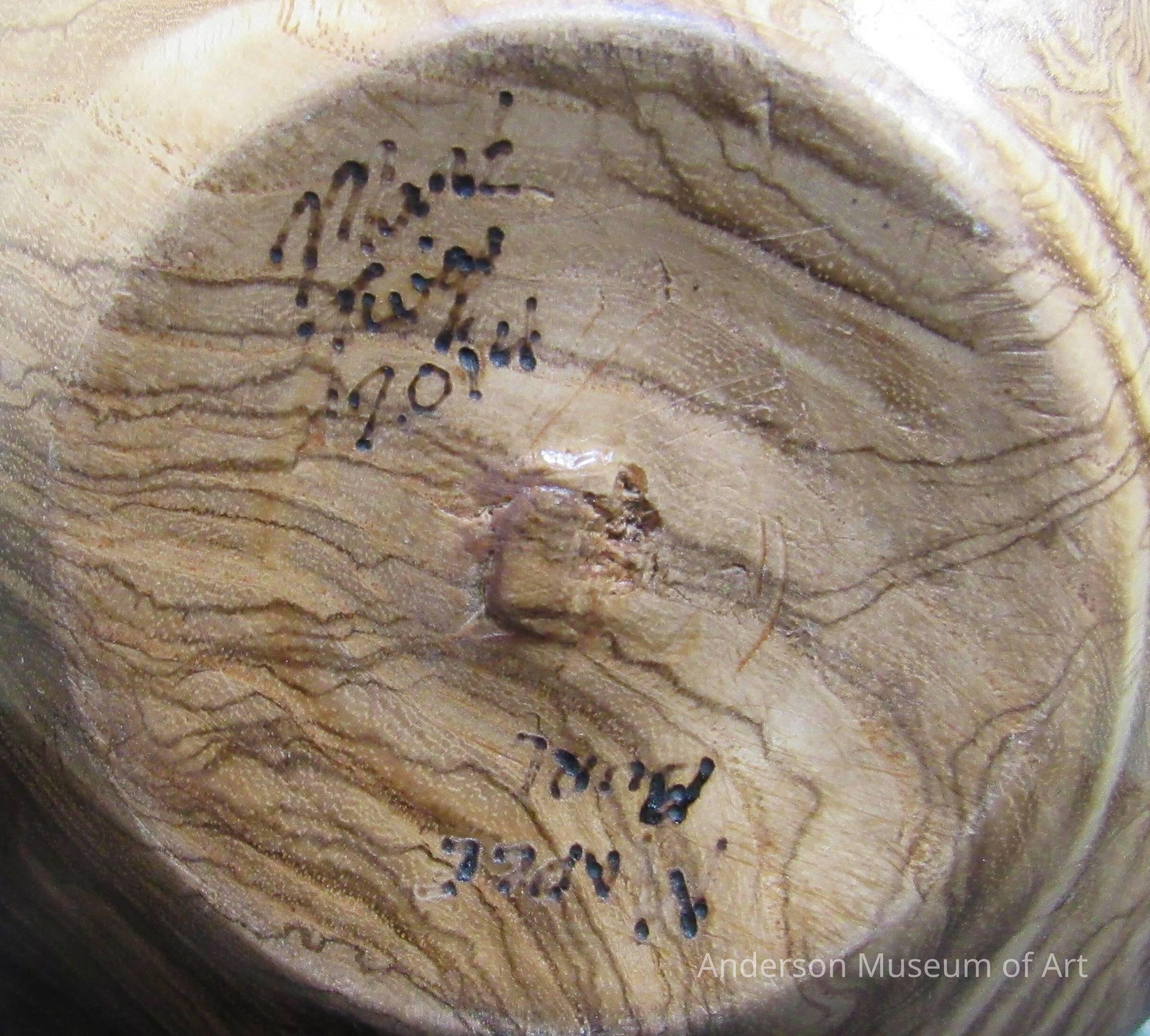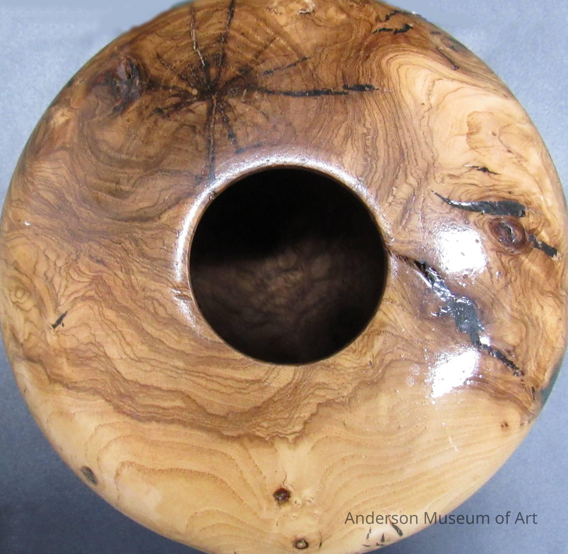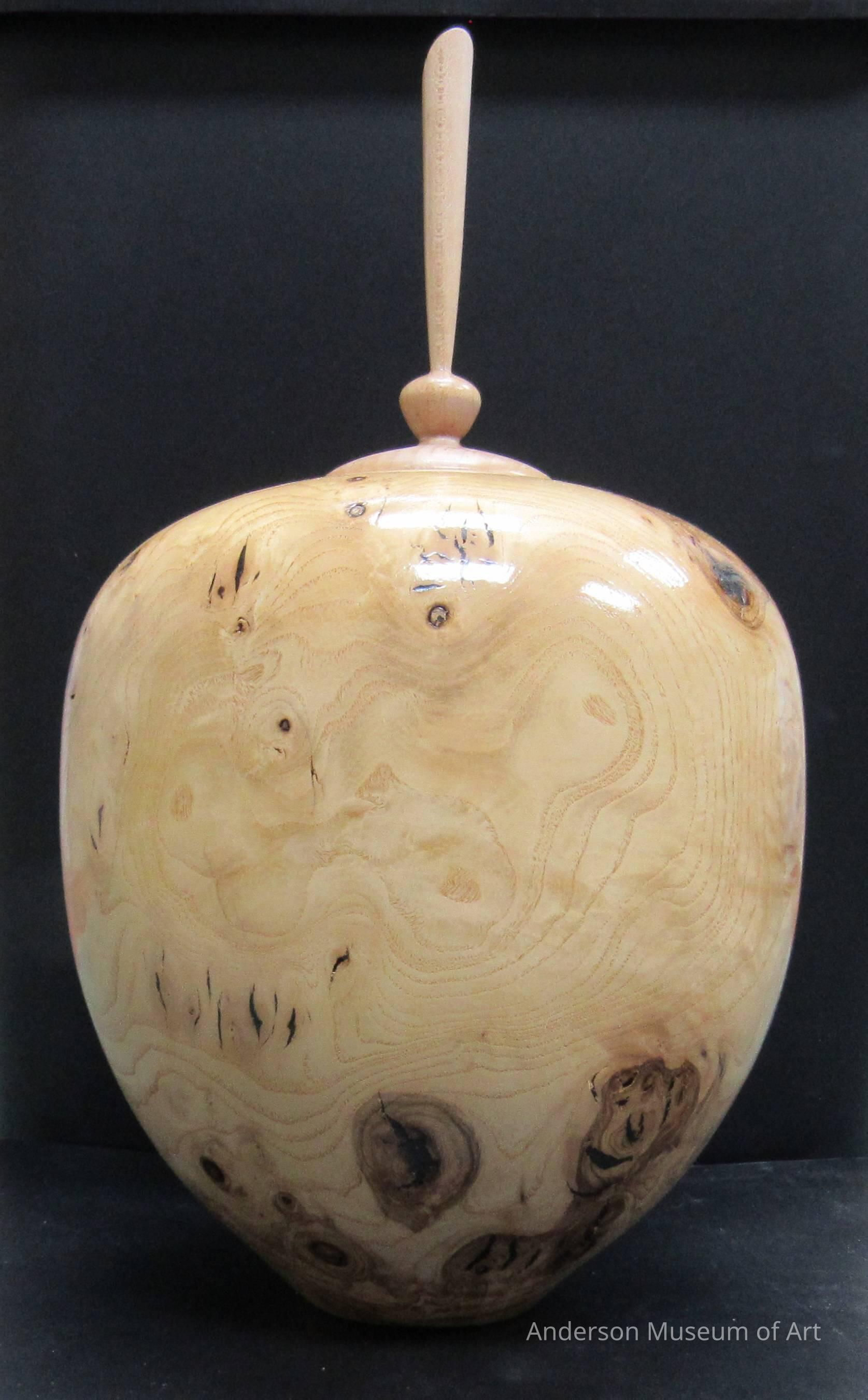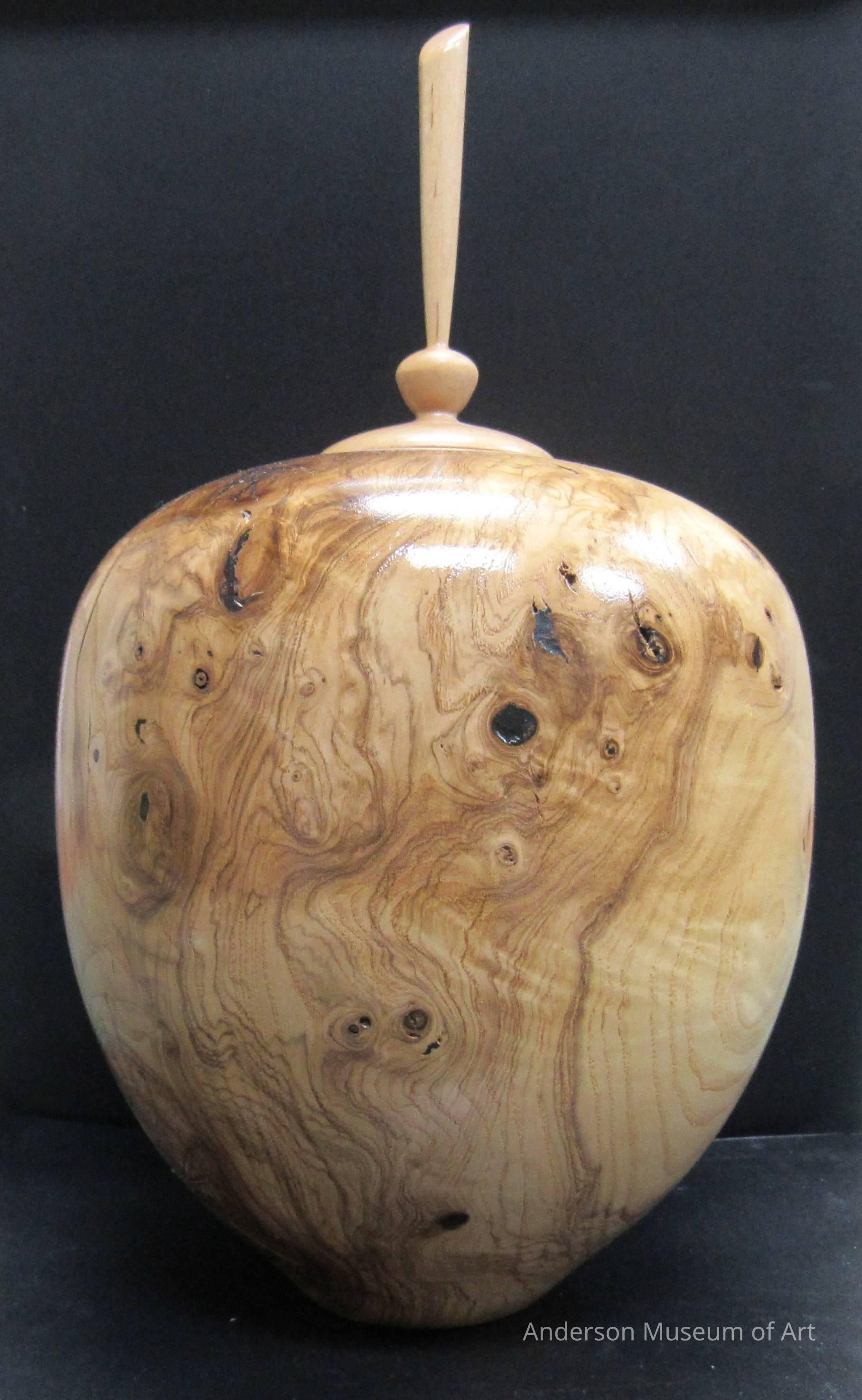 Wooden bowl with lid made of maple burl wood. The pot is a light wood but becomes darker, to almost black, around the burl areas. The diameter is almost the same throughout. The bowl tapers at the bottom and is almost flat at the top. There is a small 1.75-inch hole at the top for the lid. The lid looks like an exclamation point with the top of the point angled.Type of Sculpture