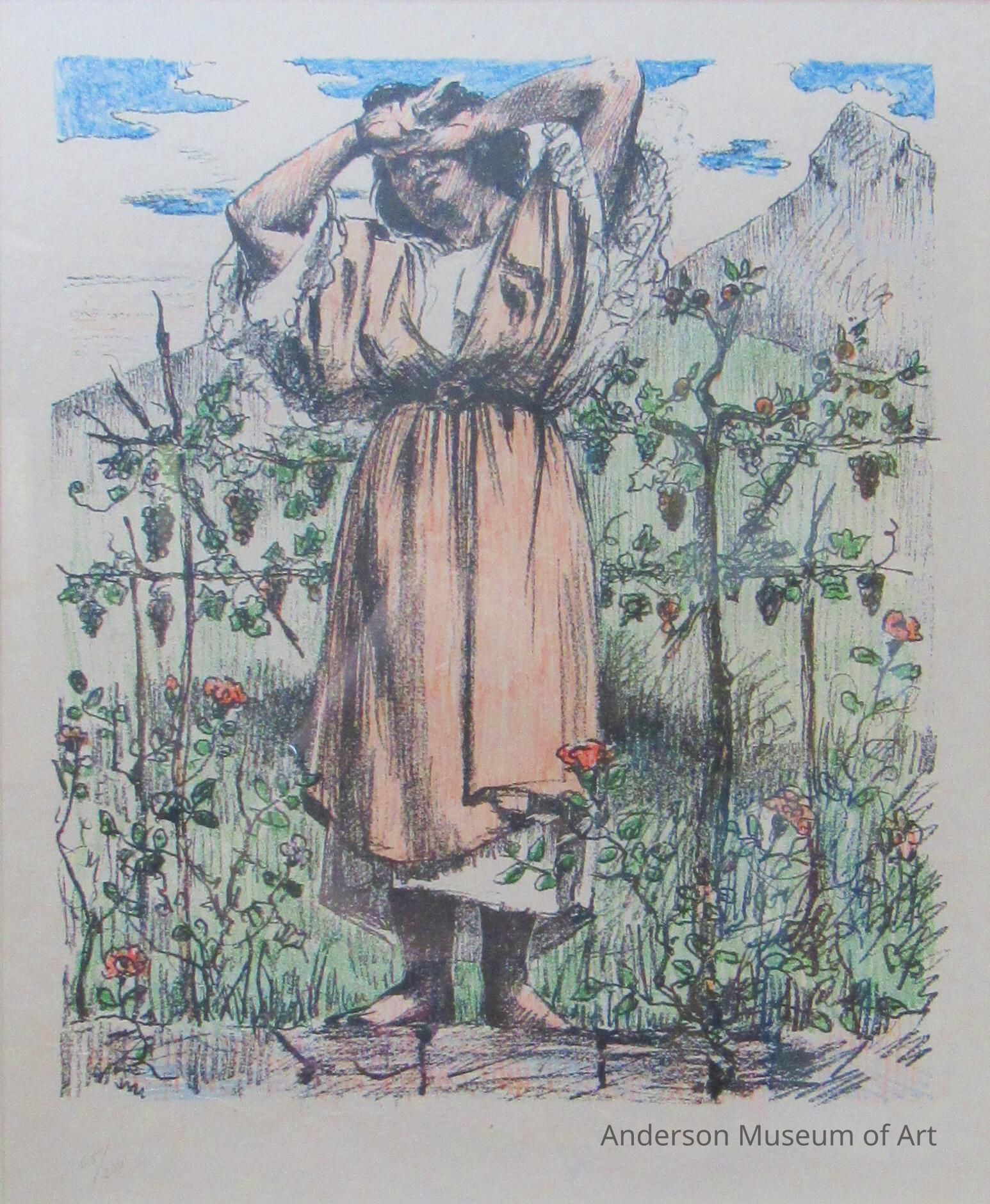 65/200 From "Das Nohe Lied", made in Berlin, Germany 1911. Female figure in grape orchard, arms raised, hands over eyes. She is wearing a white dress with an orange layer over the top. She is barefoot. There is a mountain to the right and white clouds in a blue sky. German artist (1858 - 1925)Acquisition