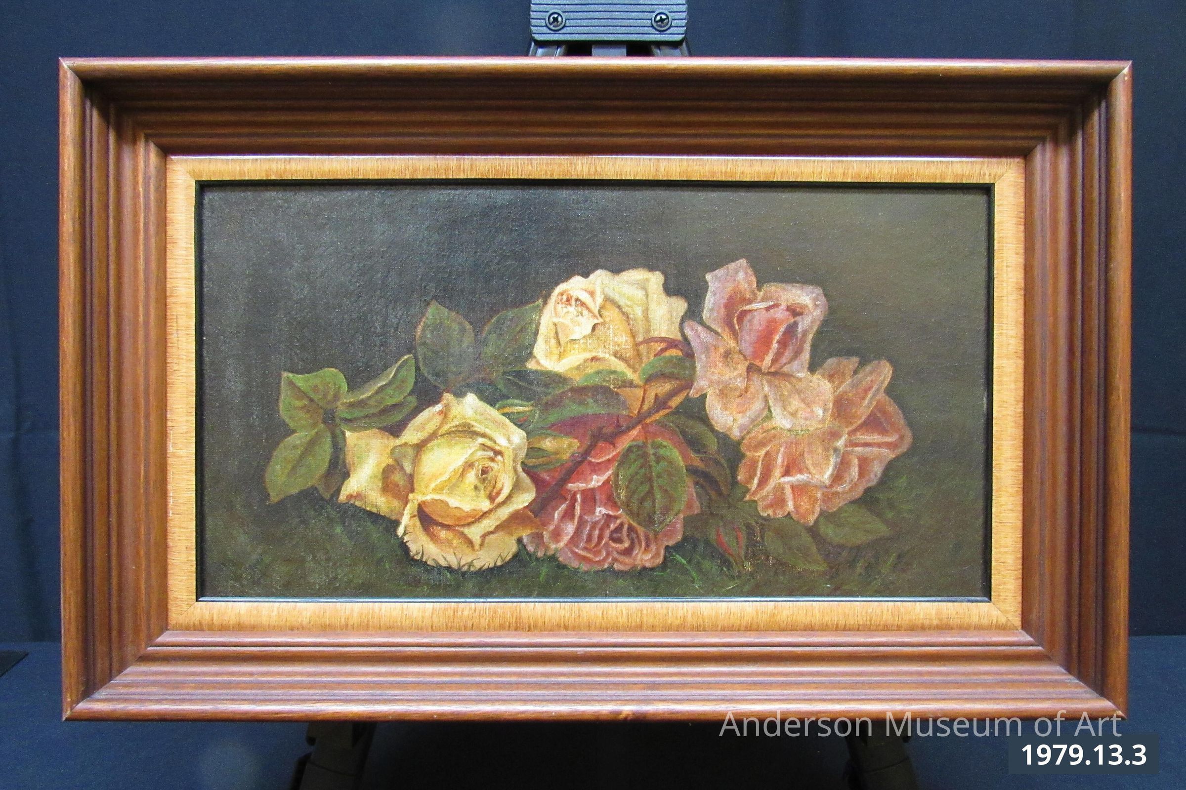 Still life of two yellow (on left) and three pale red roses (on right) set on grass against a very dark umber background. No signature.