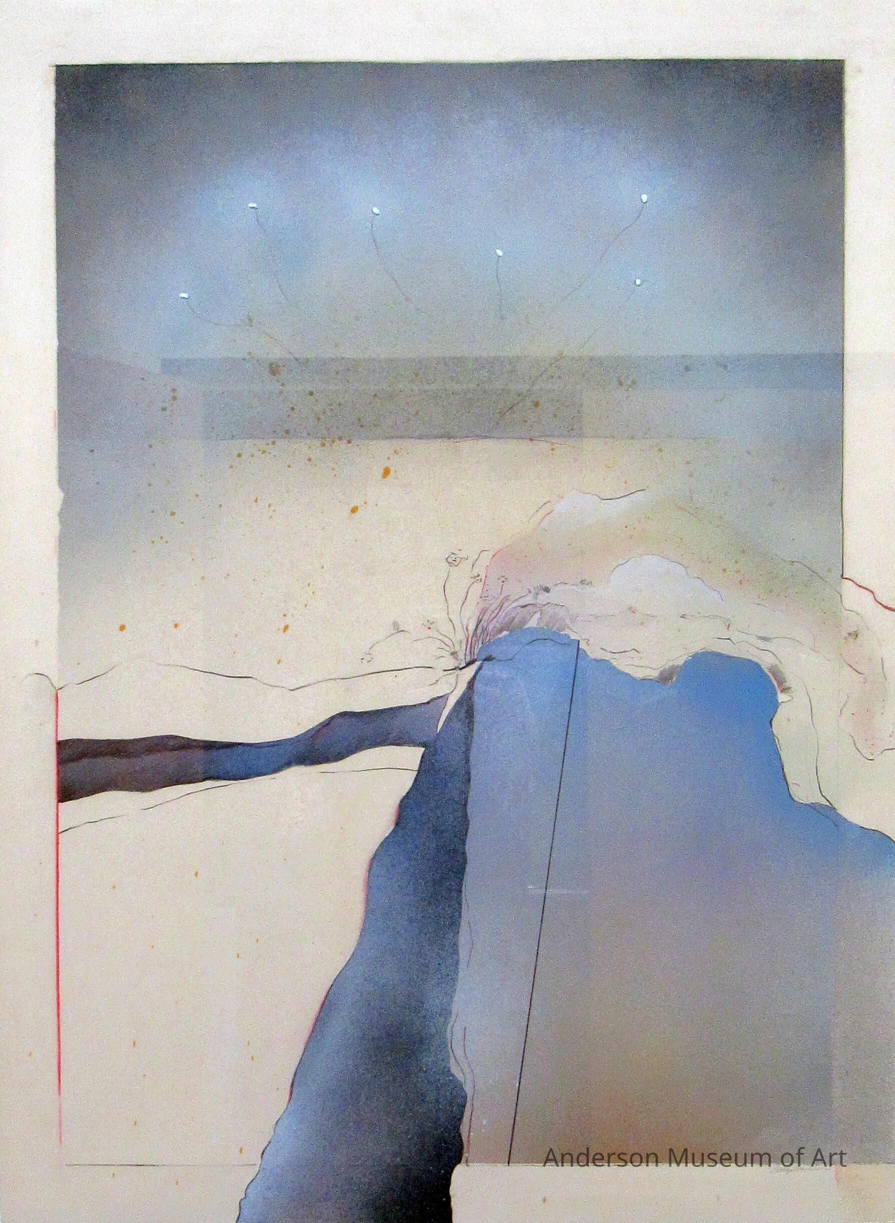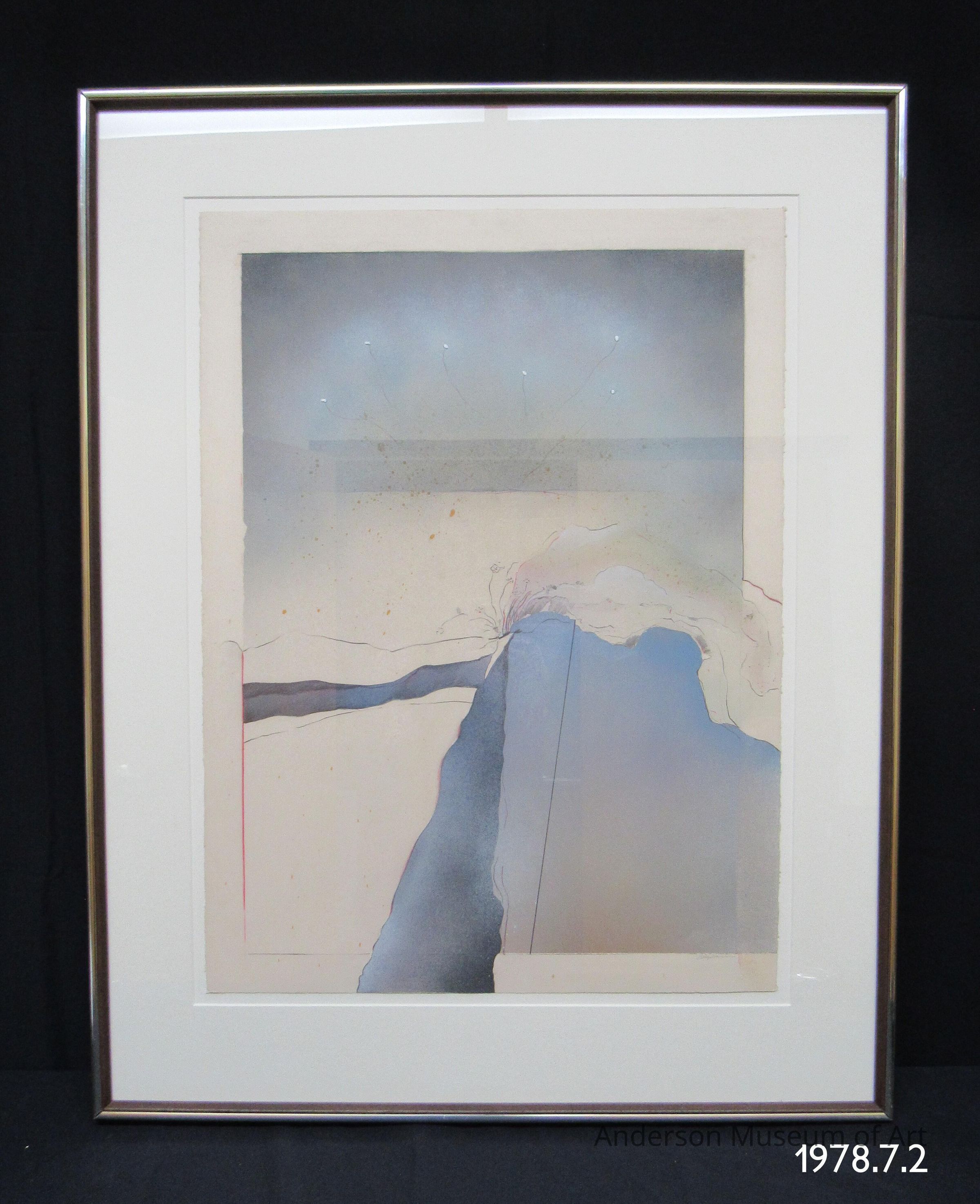 Abstract with little lightning flies jumping toward the top with some sort of volcano-like eruption at the center. The top half is square while the bottom flows off and two the edges. The basic colors are grays, blues, light greens, reds and white on tan paper. It is signed in the lower right corner "Simpson."Type of Painting