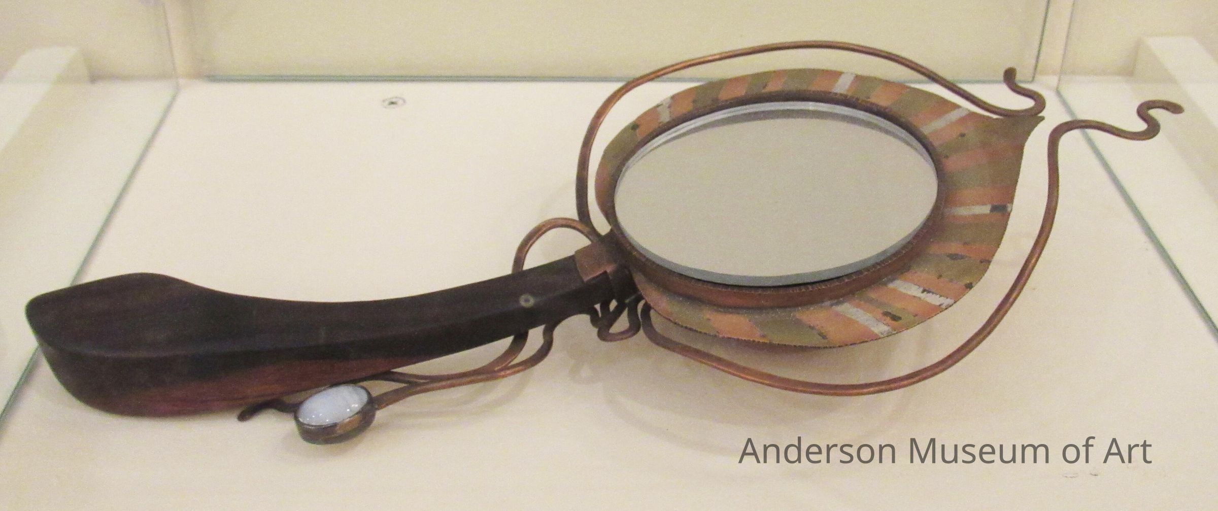 Round mirror backed by copper bowl and trimmed with a halo of alternating strips of copper, silver, and brass. Mirror attached to wooden handle. Copper wire adorns the backside, upper and lower mirror, and handle. It is accented with moonstone and lace agate.Type of Sculpture