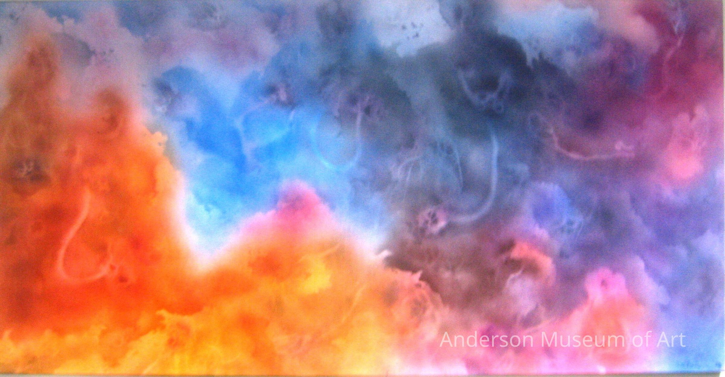 Large painting with the background a mixture of oranges, blues, purples, and pinks. Painting has a cloud-like/airy feel. Lighter colored wisps and lines throughout.Type of Painting