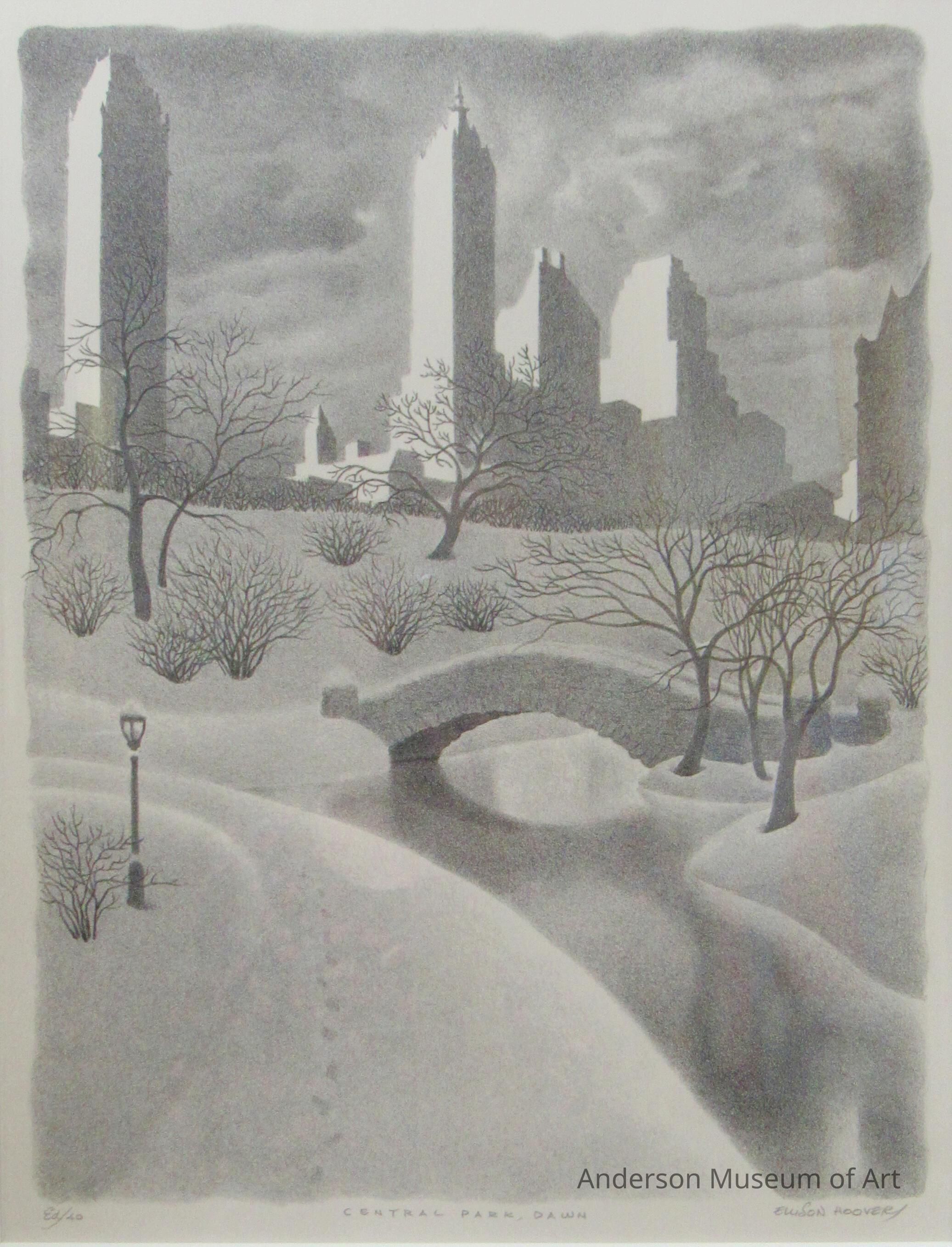 bridge. Snow covers the ground and footsteps can be seen along the path by the water. There are several bare trees and bushes in the middle ground. The background is composed of a city setting with large buildings. There is a single tall building on the left followed by some space and then a grouping of buildings of various heights in the center. The buildings are bright white on the left and in dark shadow on the right. It is signed in the lower right corner, "Ellison Hoover." Ed/40.Acquisition