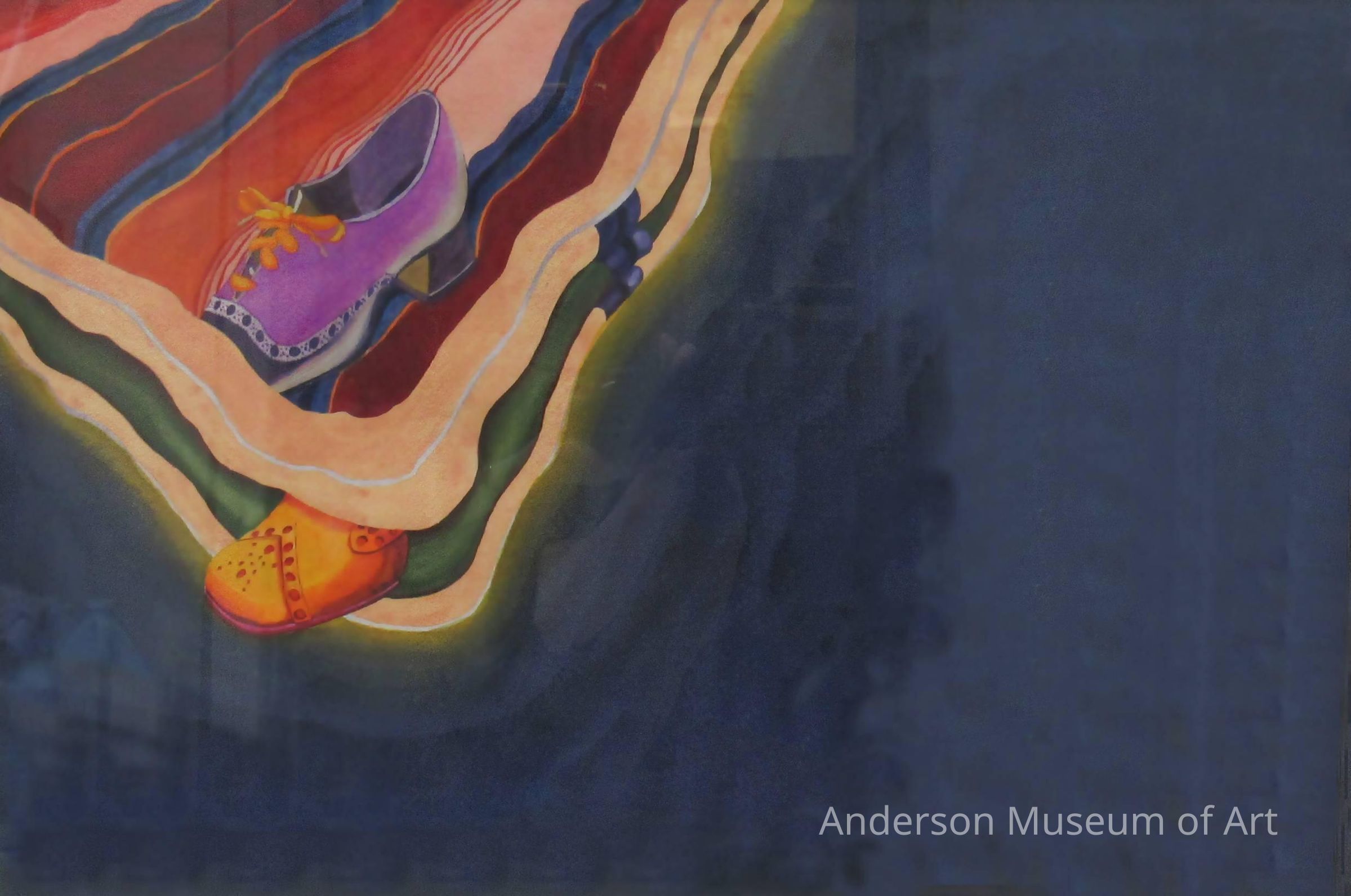 Unsigned picture of two shoes in a multi-colored field surrounded on two sides by a dark blue monochromatic field. Shoes appear to be nonfunctional and decorative in nature--typical urban attire. The upper left shoe is in shades of purple; the middle left shoes is a golden tone. Both shoes appear to be in a fabric space that is suggestive of a bed, though its lines are much freer and appear to float in the blue color field that makes up most of the pictorial plane. Paper is good quality bearing the watermark "Arche" in the lower right corner.