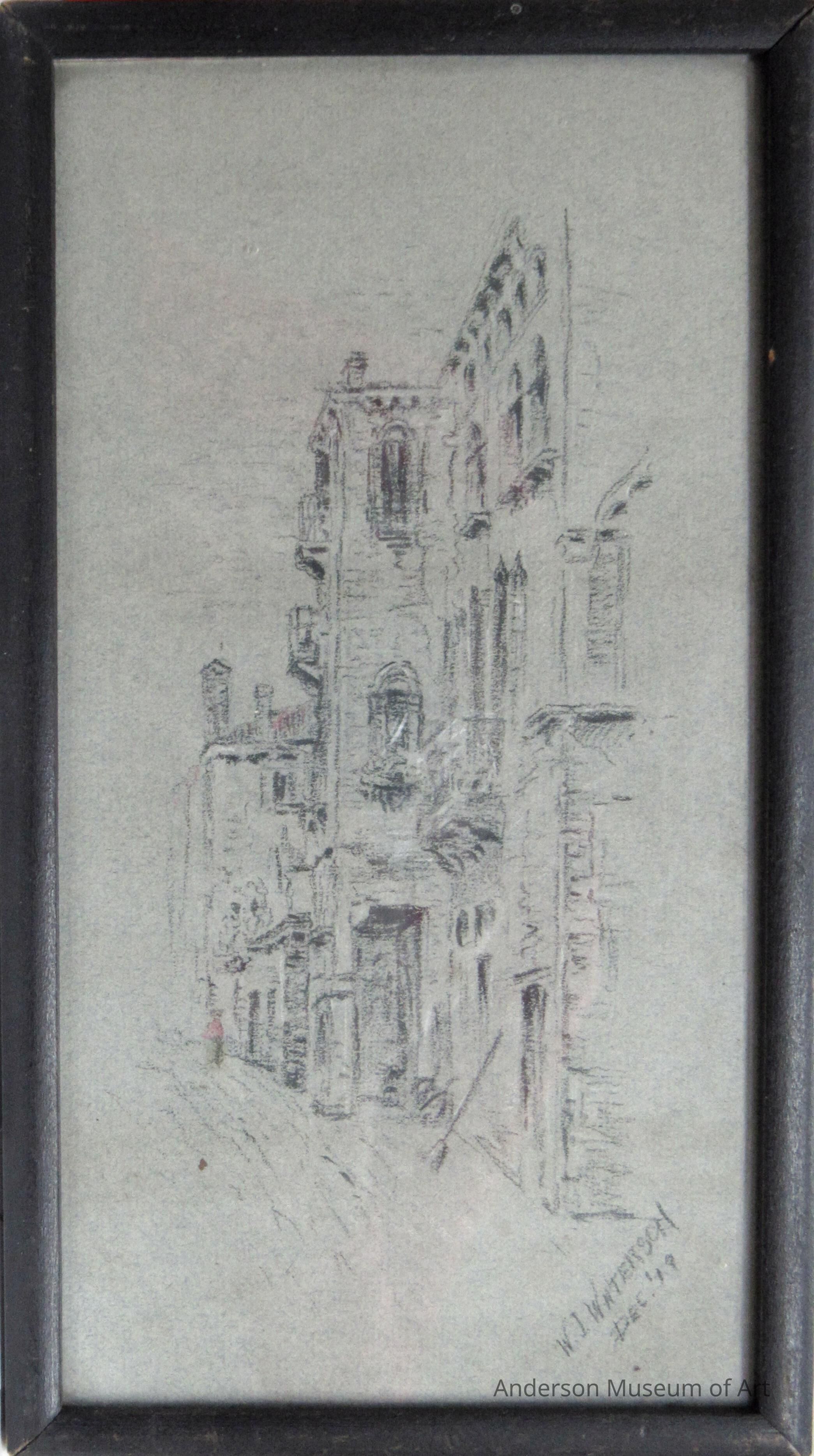 Sketch of perspective view of tall, stone, and brick buildings along the right side. There is a lone figure walking down the road in front of the buildings. There are small areas of color, ie person, some areas of the building. Signed and dated "Dec. 19" in the lower right corner.Type of Drawing