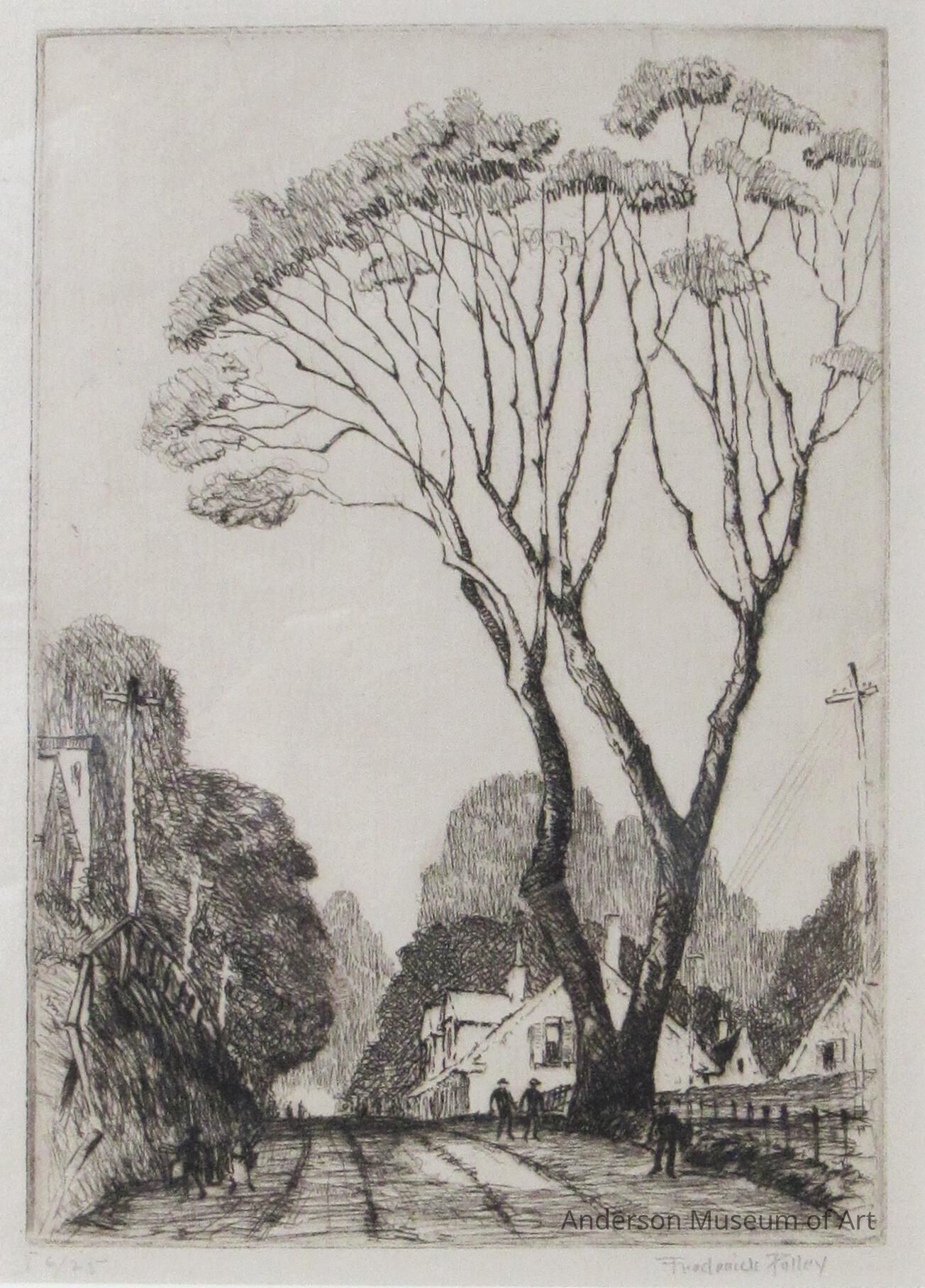 Etching of a small town. A thin tree with leaves just at the top dominates the image in the foreground. The tree is on the right and extends almost the entire page from top to bottom and left to right. There are buildings behind the tree along a road with four tire tracks. There are roughly 8 people walking along the road at various distances. Along the left are houses on a small hill with a row of telephone poles and a fence. There are more trees throughout the background.