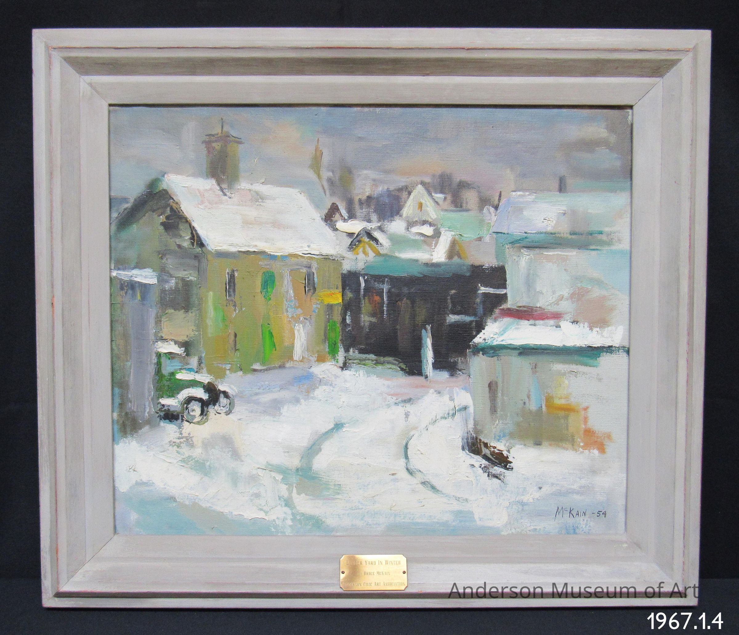 Oil on canvas depicting several buildings in a winter scene. A road begins in the immediate foreground and curves around a building out of sight in the middle ground with ruts in the snow. On the right is a green snow-covered vintage vehicle (either a car or truck). The basic color scheme is very gray with bits of color in the buildings. The building on the front left is an ochre color, center building is brown, and the buildings on the right are white. It is signed and dated "McKain -54".