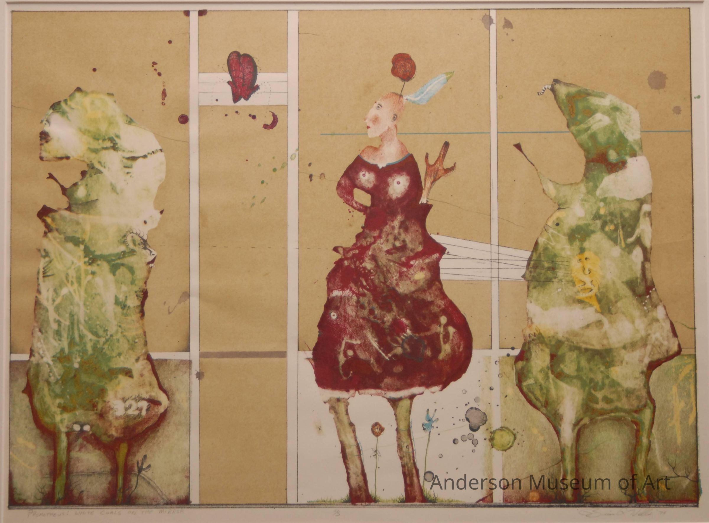 Color lithograph on off-white paper with no watermark. Image is divided into 4 spaces with vertical white lines. Left space contains an abstract form, possibly human or animal, standing on two legs with vegetation below. The background is a multi-colored textured pattern in the bottom 1/3, above that is a white line, and the top 2/3 is a beige colored field with some droplets of red and brown. The second space contains a beige color field divided by a brown line 1/3 up with a red butterfly in the upper 1/4 surrounded by black dashed lines and droplets of red and green. The third space contains an abstract female figure in red with head in profile looking left and the body in 3/4 pose. The figure's face has make-up with lipstick and eye shadow. One hand is on her hip, and her left hand is extended upward from her elbow. A red rose and a blue feather extend from the head of the figure. The the figure is grass, one red flower and one blue flower. Droplets of gray, red, and green appear at random around the figure. The fourth space (right side) contains a similar figure with