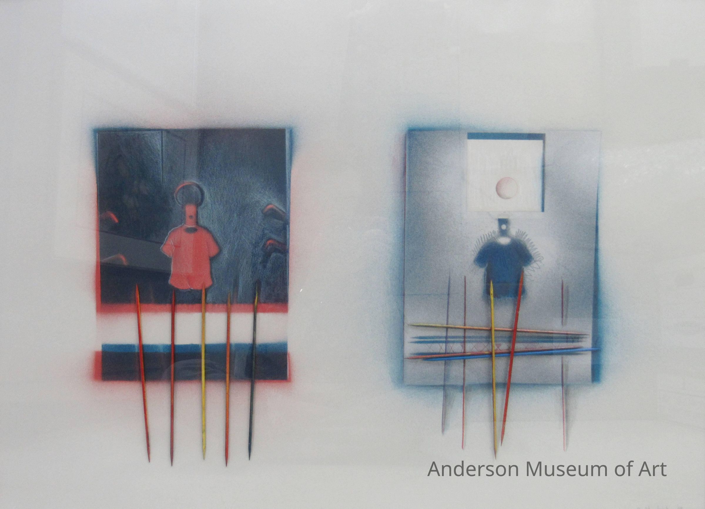 Consists of two central rectangular images, each measuring approx. 7.5 x 12 and separated by an untreated portion of paper approx. 4.5 wide. The left image consists of a primarily dark blue background which appears to have been spray-painted onto the surface. Within this dark backdrop are the following images: a form in red, outlined with white, and suggestive of a t-shirt; a long rectangular form suggestive of a human neck is above the neckline, also in red, and on top of the neck is an ovular bubble of dark blue outlined in red. Within the confines of the dark blue square background, there are also four images of smoking pipes turned bowls down; two are in the LL and two in the LR. At the bottom of the image are five vertical sticks painted red, orange, yellow, and dark blue. Just below the central image is a dark blue rectangle outlined on three sides in red. To the right is another image in a rectangle painted in blues and silver. It is large and the size of the left two rectangles together. There is a human form in this rectangle wearing a blue t-shirt. There is again a suggestion of a neck with no head. Beneath the shirt are sticks painted red, blue, and yellow. Three are horizontal and two are vertical.Collection
