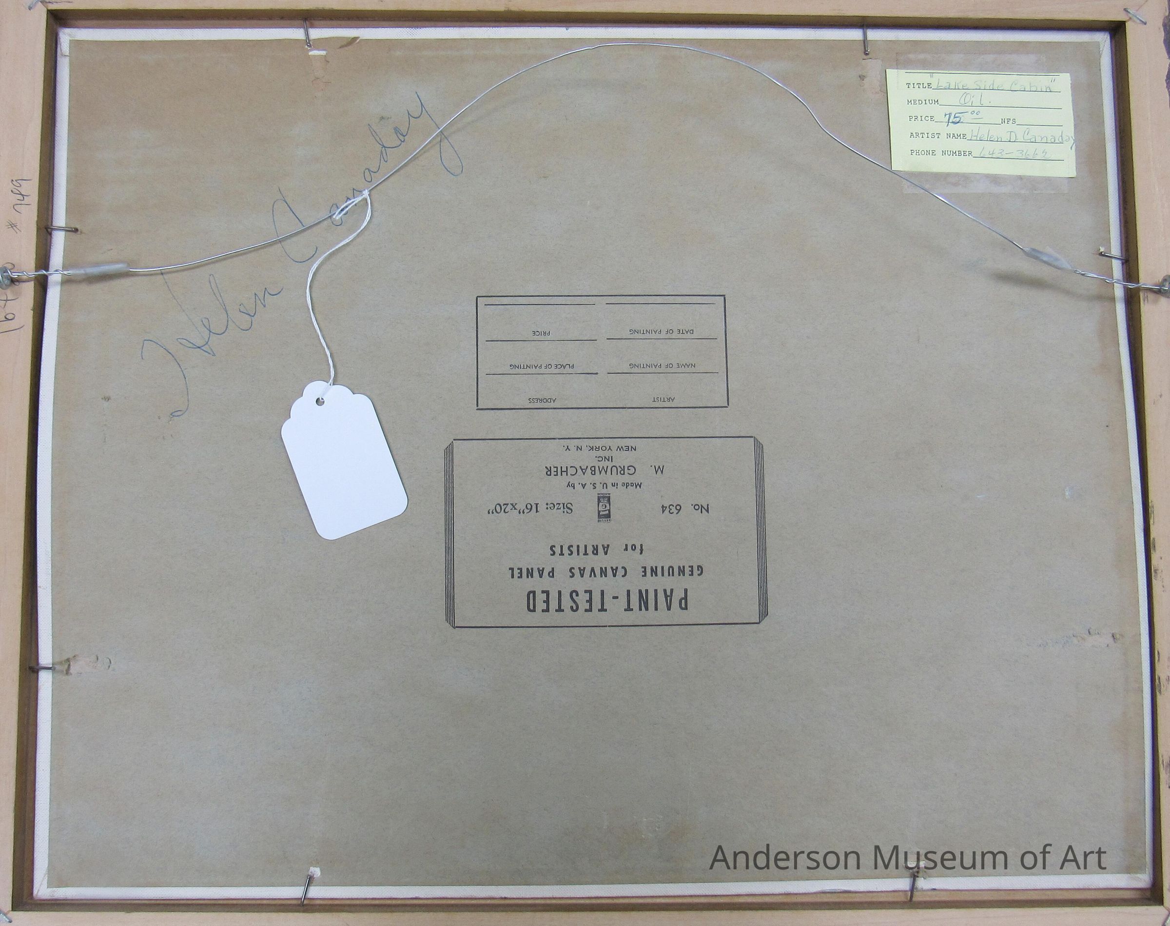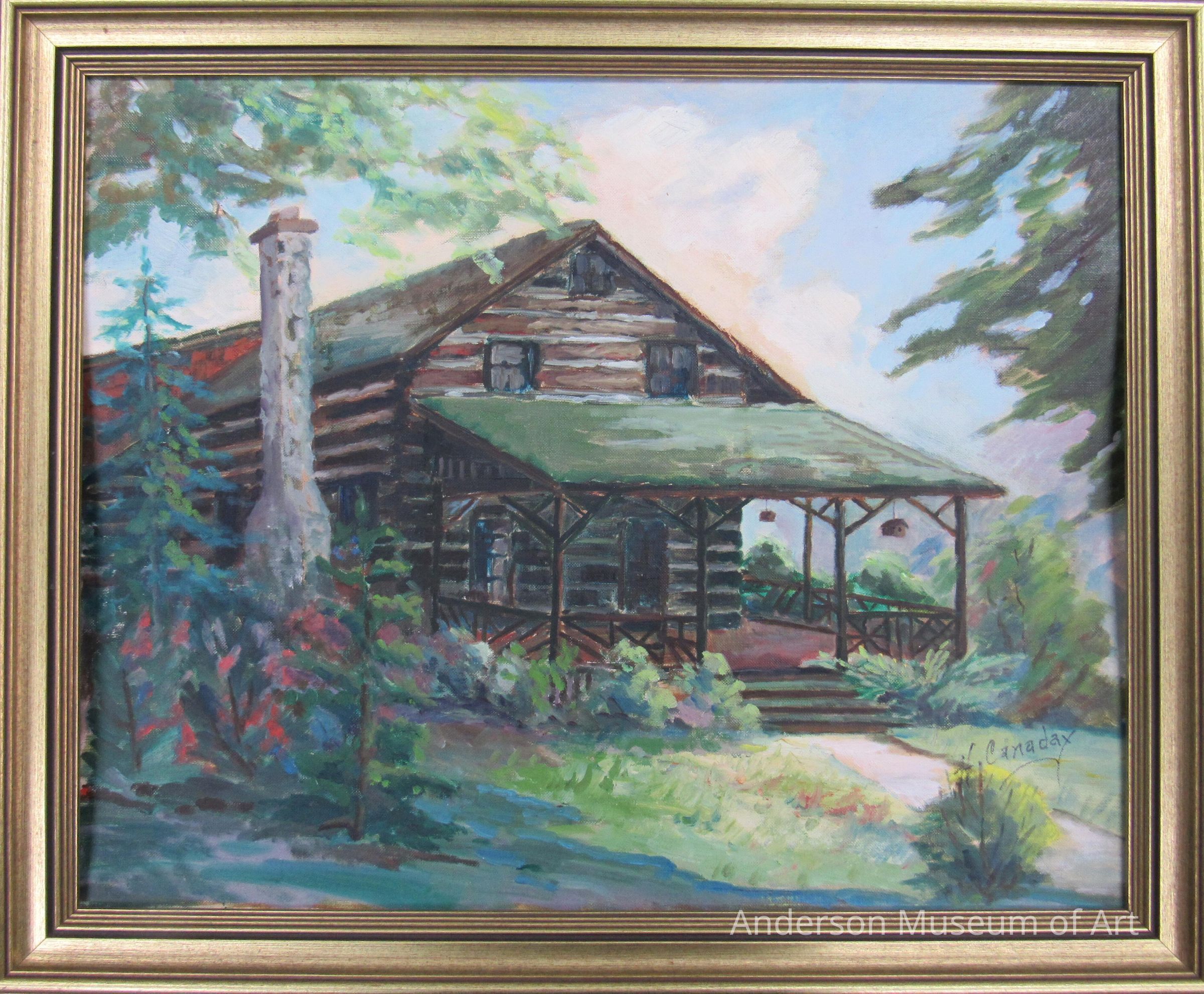 Painting of a log cabin with a green-roofed front porch. There is a chimney on the left side of the cabin and two birdhouses hanging on the right side of the porch. There are small trees and bushes surrounding the house. A small path leads up to the porch from the bottom right corner. Suggestions of two large trees, one on the right side and one at the top left corner.Type of Painting
