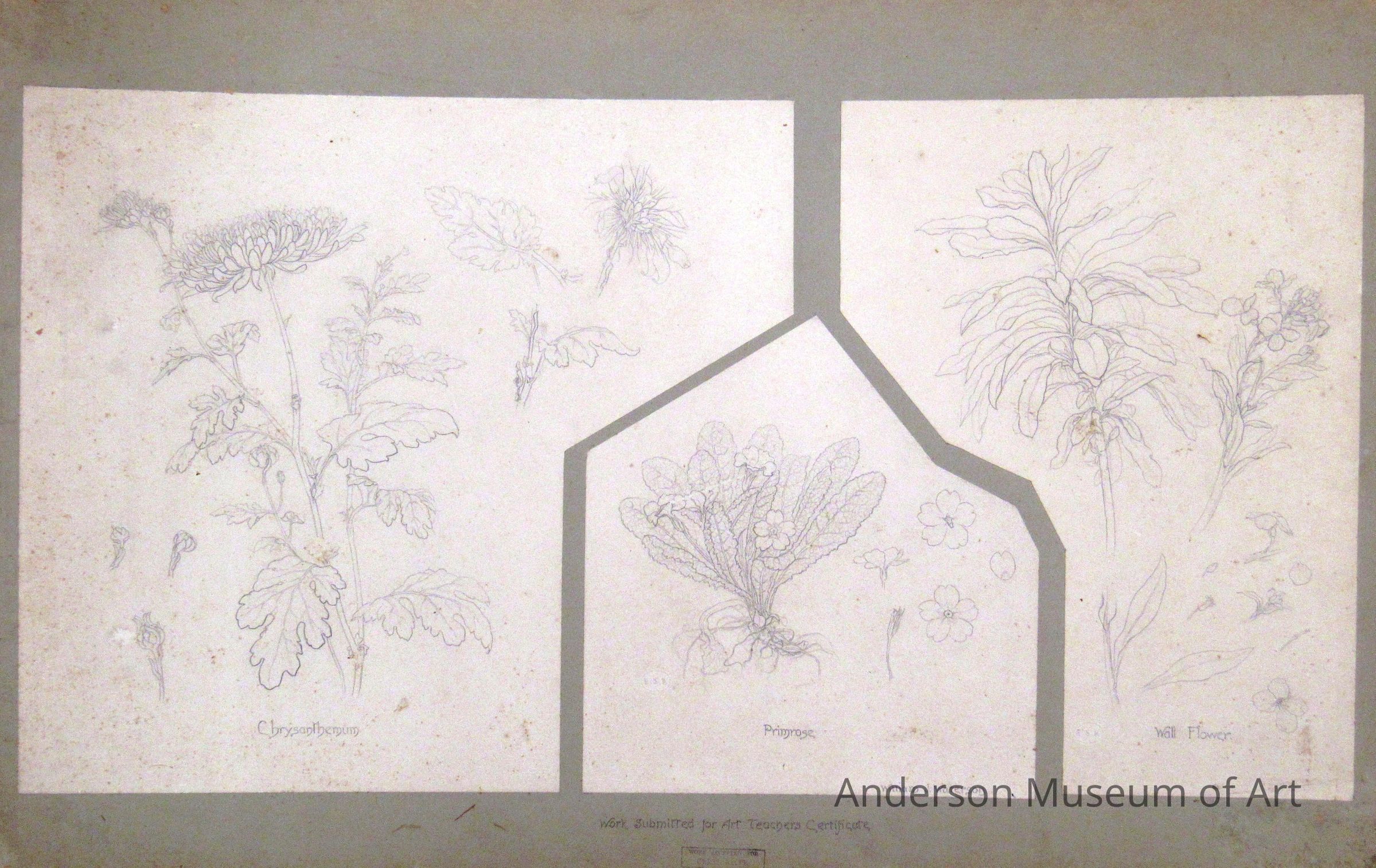 Three pencil sketches of flower studies. The flower study on the left is labeled "Chtysanthemum". There is a large sketch of the full plant as well as more detailed looks to the right. In the center if "Primrose" with a full plant and single details to the right. On the right is "Wallfower" with leaves on the left and flowers on the right. Signed lower right of the primrose section "William J. Waterson". It is marked "submitted and accepted for teacher's certificate". Label on back "Number of work 32 / Waterson, William John / Age 20."Type of Drawing