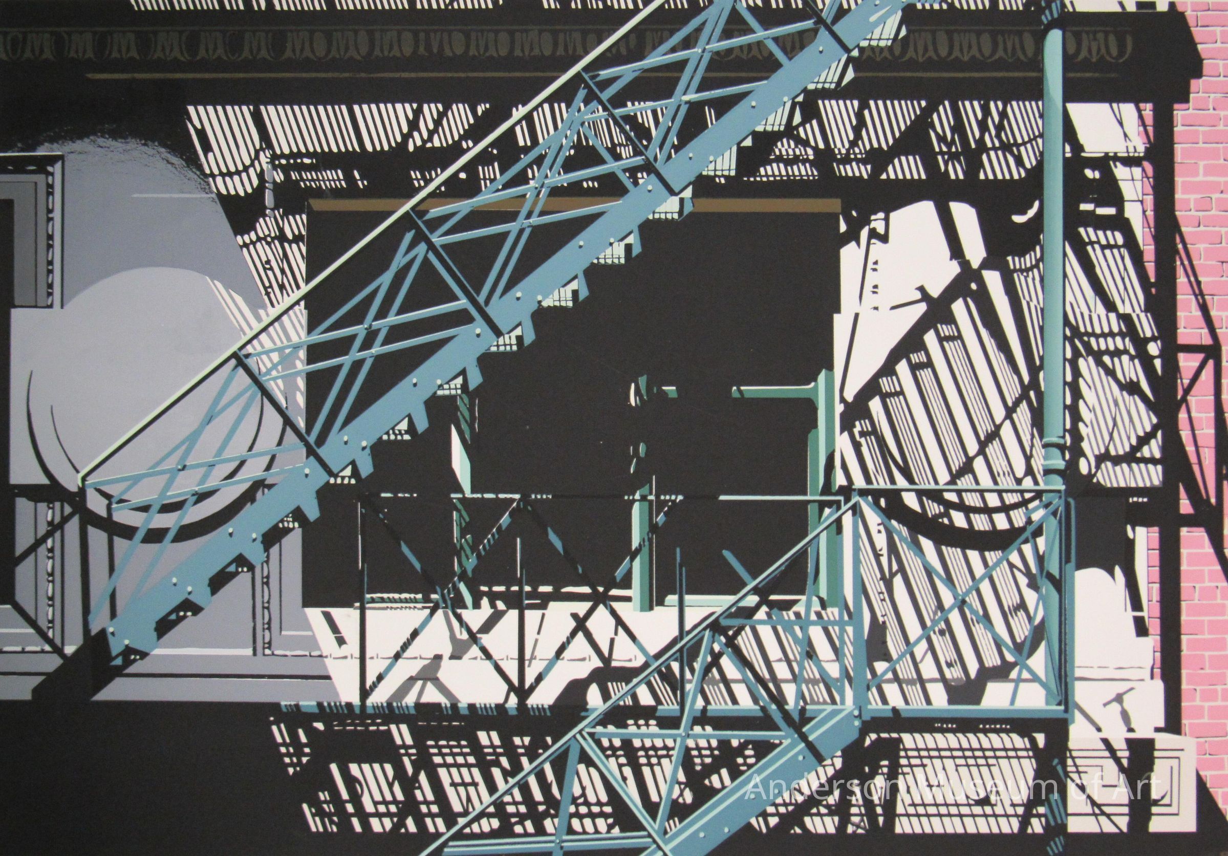 Close-up view of a metal staircase along the side of a building. The stairs are turquoise and case a heavy shadow on the building. There is a grey architectural area along the left, a green window in the center, and pink bricks along the tight side. Print 15/65.Collection