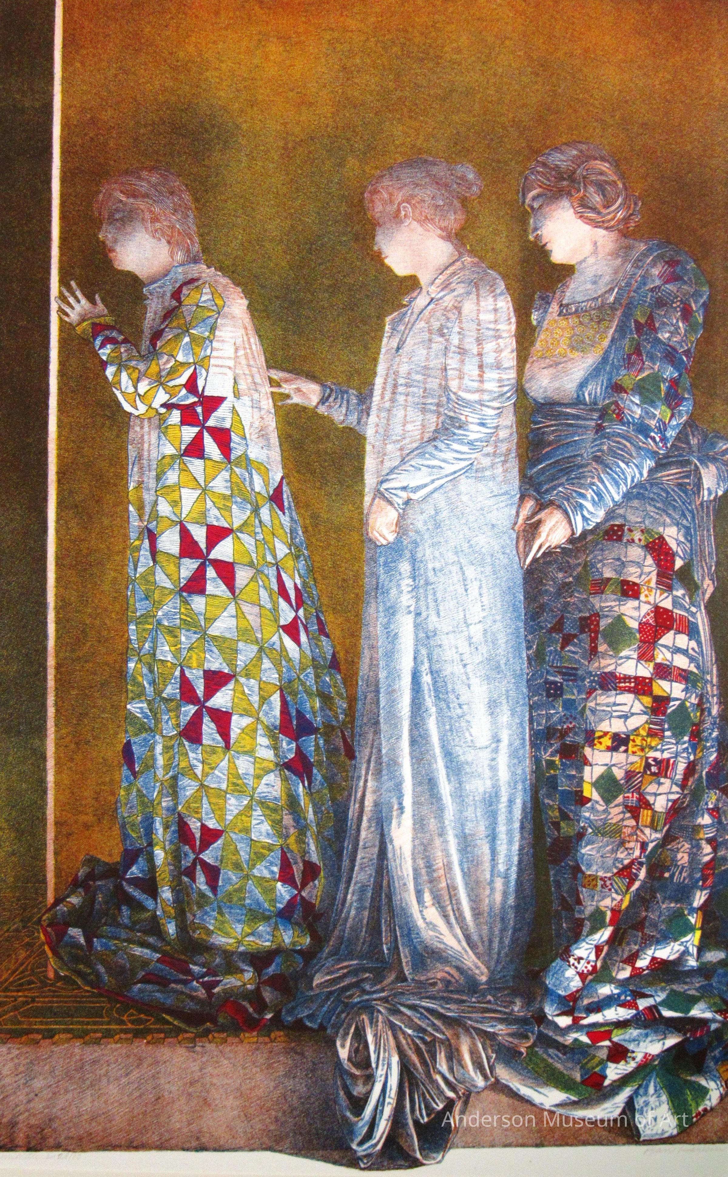 Color lithograph (multiple colors) on medium white paper with watermark. The image depicts 3 female figures dressed in bedclothes (nightgowns) standing one behind another in profile facing left, against a wall. To the extreme left is a doorway of which only part is shown. The middle figure appears to be wrapped in a sheet, while the other figures appear to be wrapped in patterned quilts. The print is titled and numbered in pencil below the image to the left, "Premonitions 28/60" and is also signed in pencil below the image to the right "Alan Larkin".