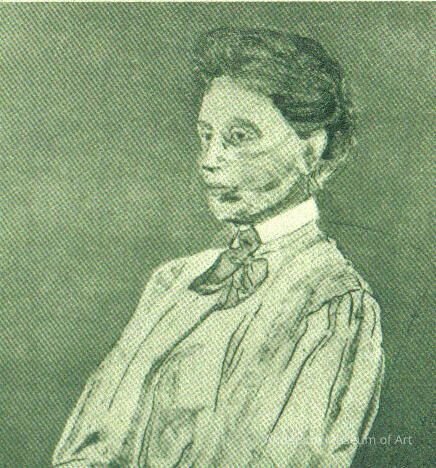 Image of an older woman in what appears to be a seated position. She is staring out to the viewer's left. She is wearing a loose fitting white blouse with a tie around her neck that obscures the buttons on the blouse. Her hair is tightly pulled back. In appearance, she is both young and old at the same time. Her face seems to be of particular interest to the artist. It is scored with an elaborate plowing of fertile crosshatchings which seem to be everywhere and go everywhere. It is remarkable that such subtle beauty can be achieved from the rough handling of the medium.Collection