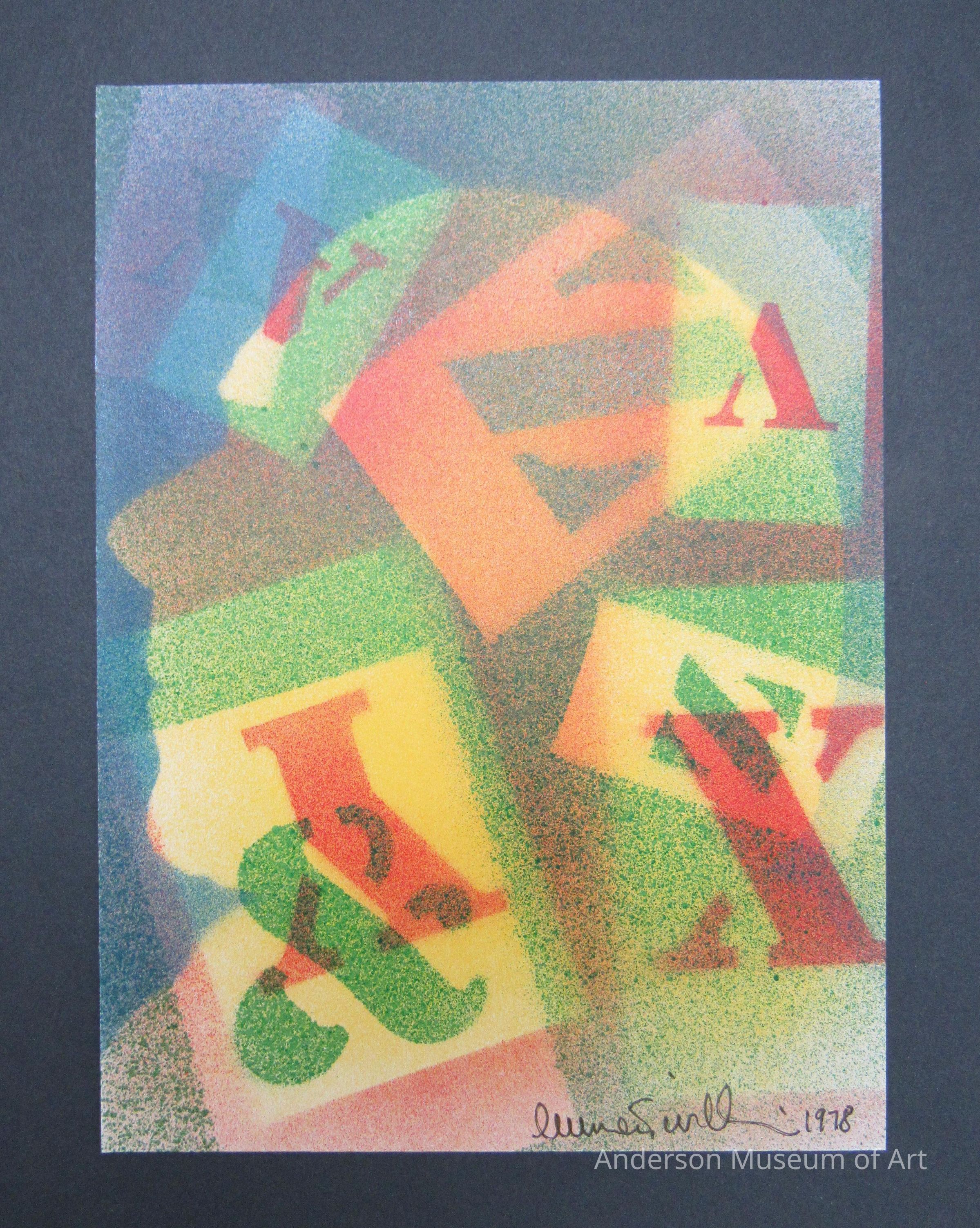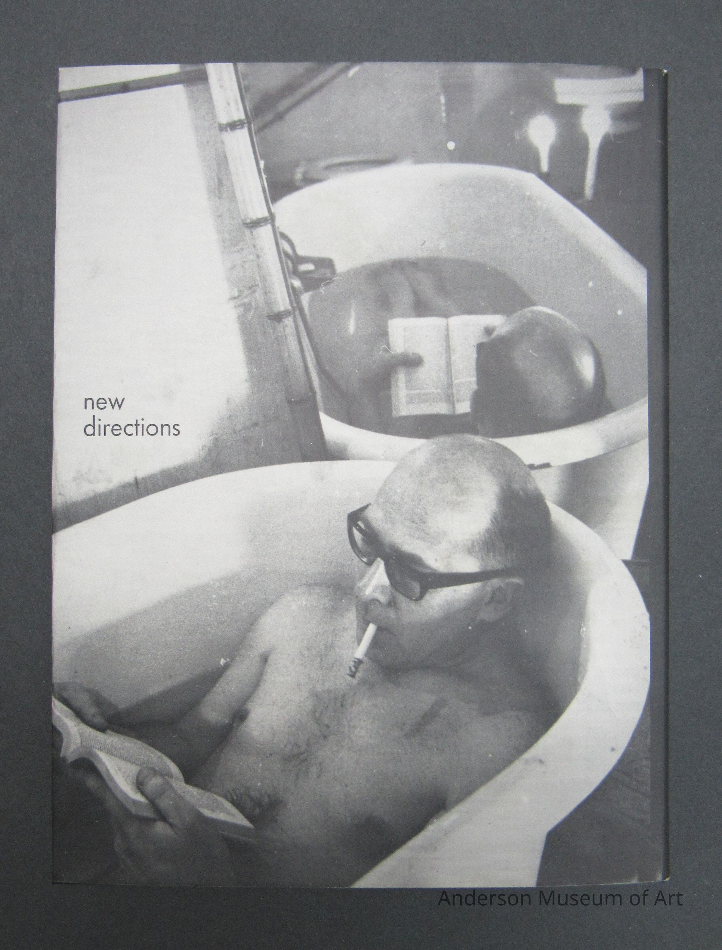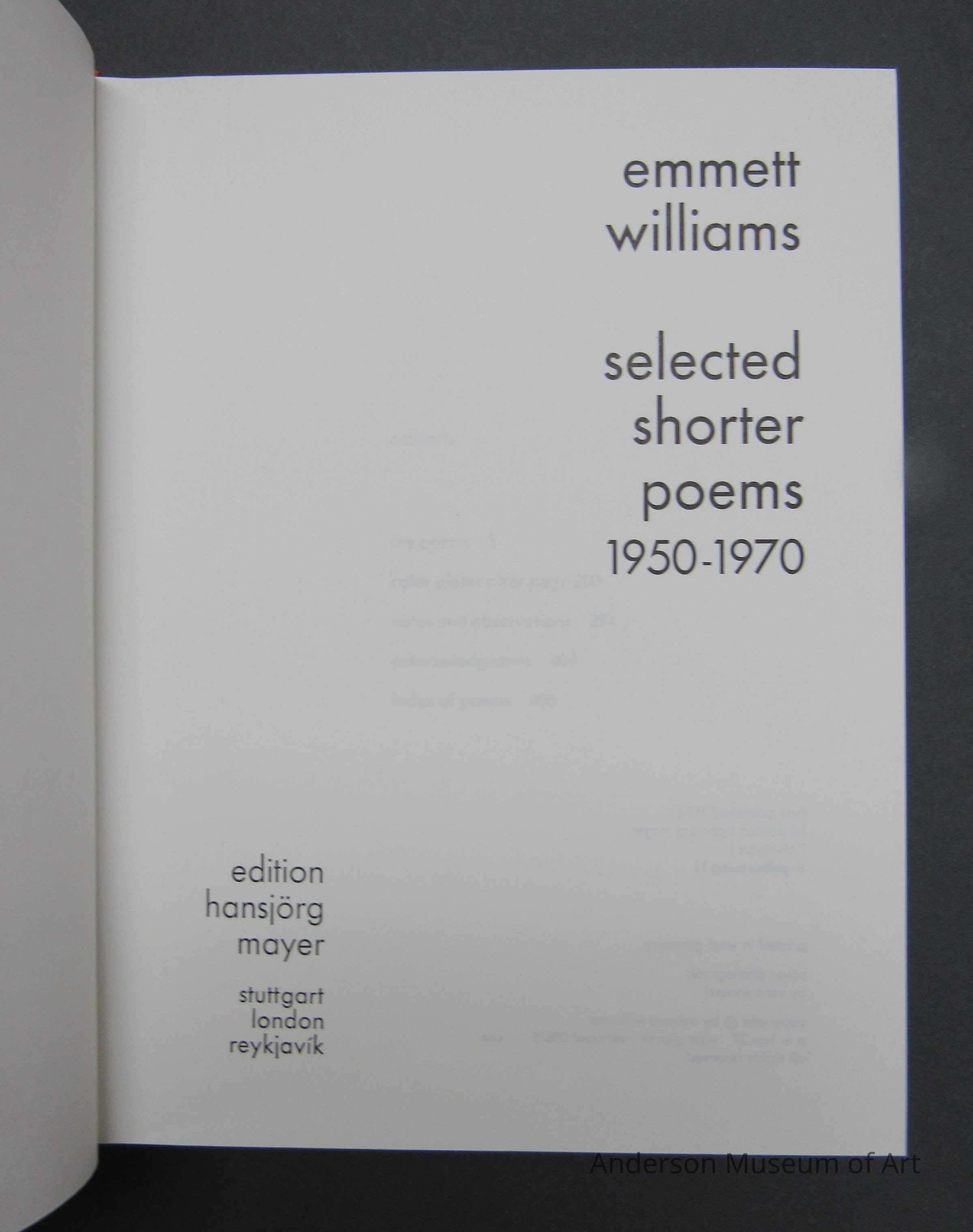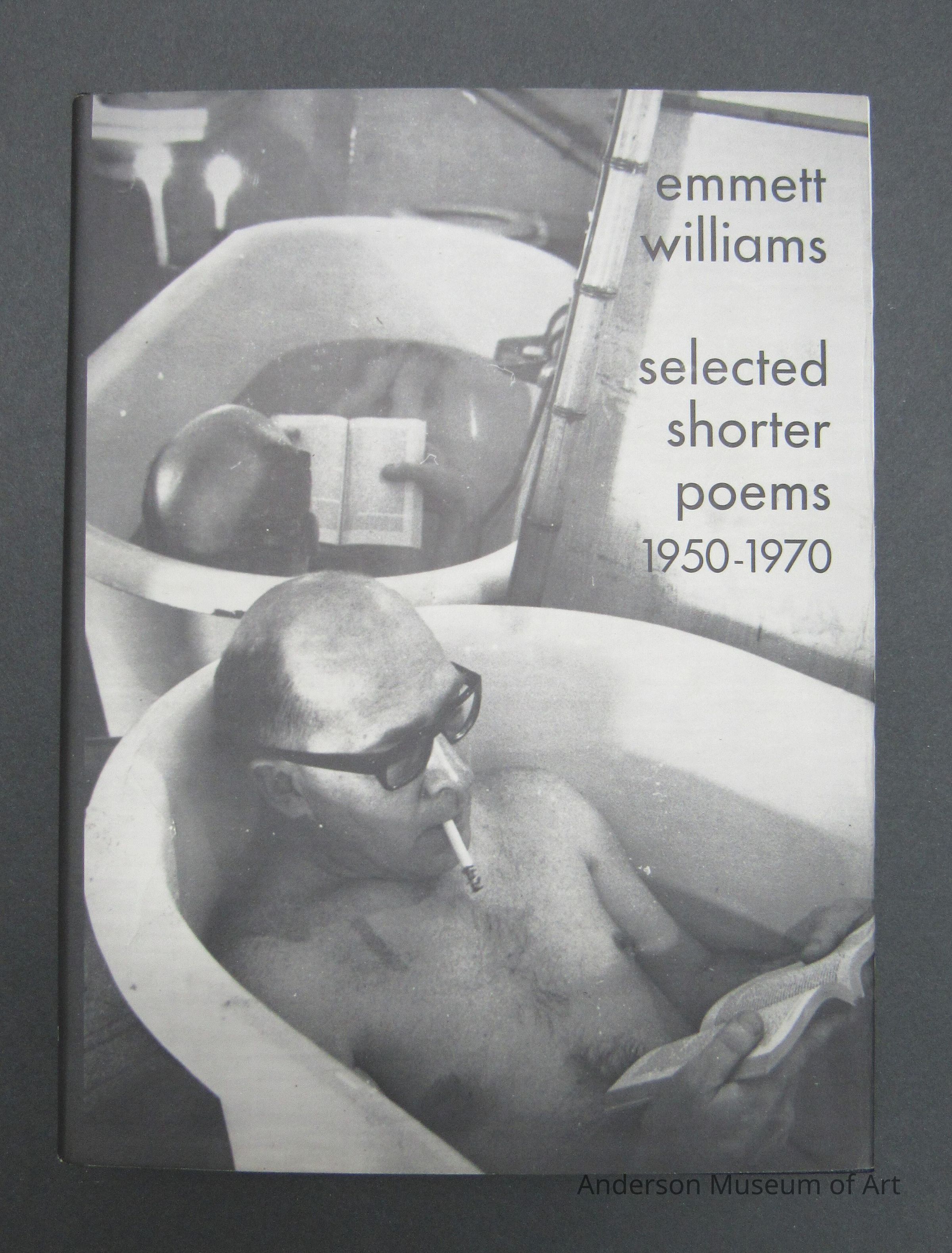 Selected Shorter Poems (1950-1970) by Emmett Williams. Hardcover book with slipcase with original drawing signed by artist. 420 pages with 8 color plates. Edition for Europe 1000 copies made. Created in 1974. Black and white photograph on the cover of a man in a tub with black framed glasses, smoking a cigarette, and reading a book. The print included is on a thick paper, very colorful, and made up of stencil letters on top a silhouette of the side view of a man's face who is looking left. Signed and dated 1978. First published 1974 by edition hansjorg mayer. Printed in West Germany. Book fits in a black slip case.Collection