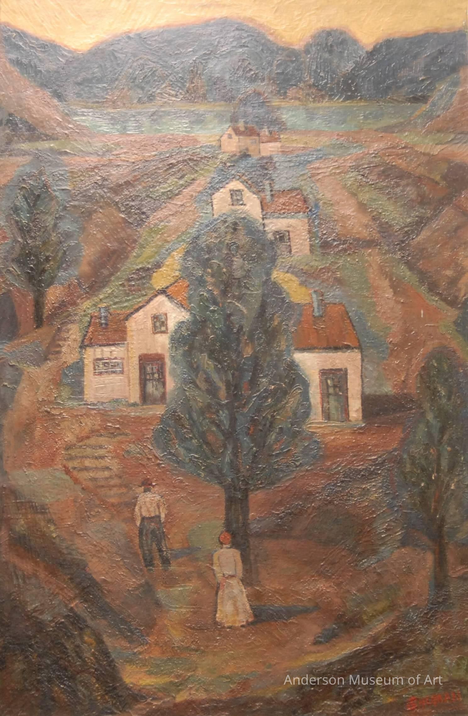 Oil on canvas panel done in medium impasto depicting a landscape with a central tree and 3 buildings in perspective behind the tree. In the background are mountains reflected in a lake. There are two figures in the foreground, a man and a woman. The color scheme is mostly green and browns. The painting is signed "Shuman" in red in the lower right corner. Several tags with addresses and price on verso.