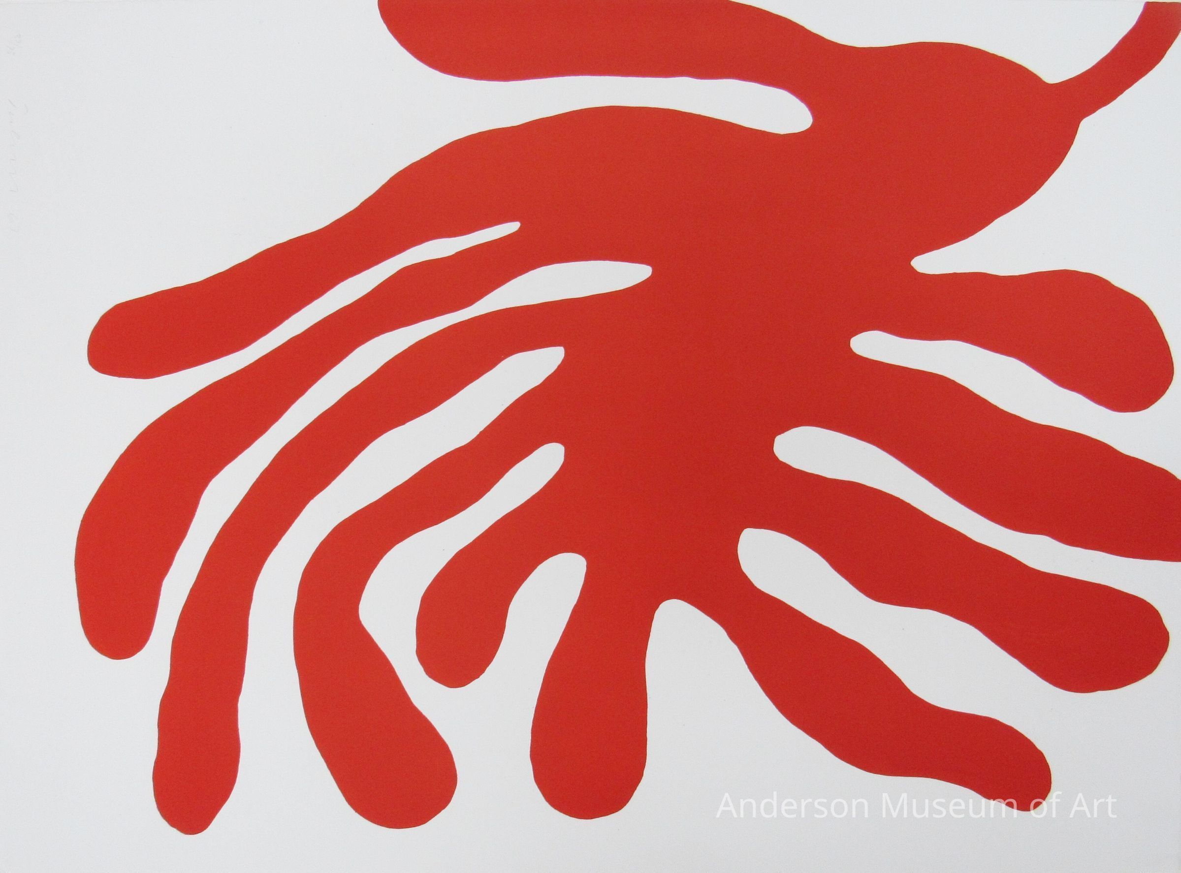 Large red leaf-shaped object coming from the top right corner and against a solid white background. The object has eleven finger-like shapes protruding. Print 37/75.Collection