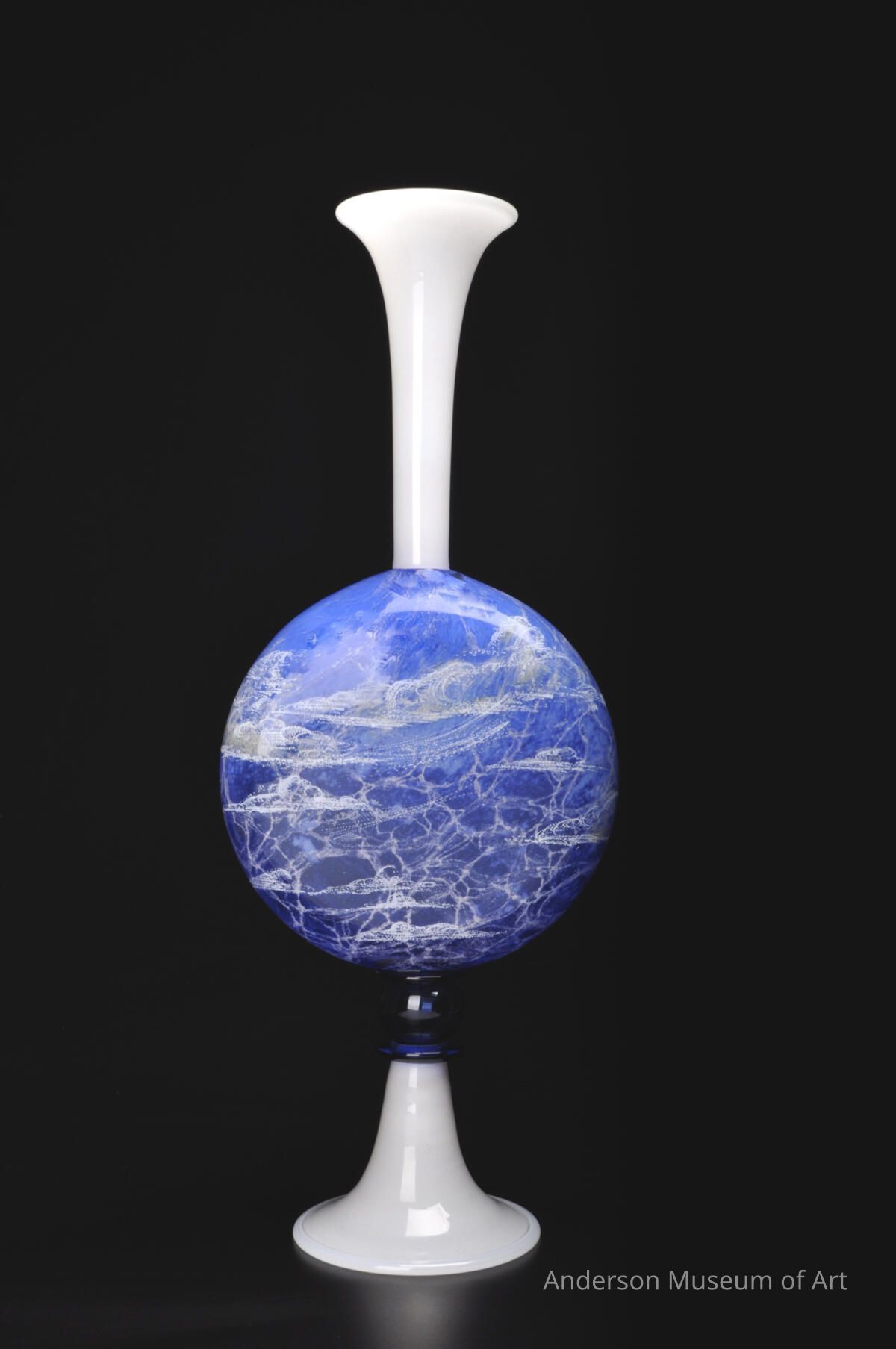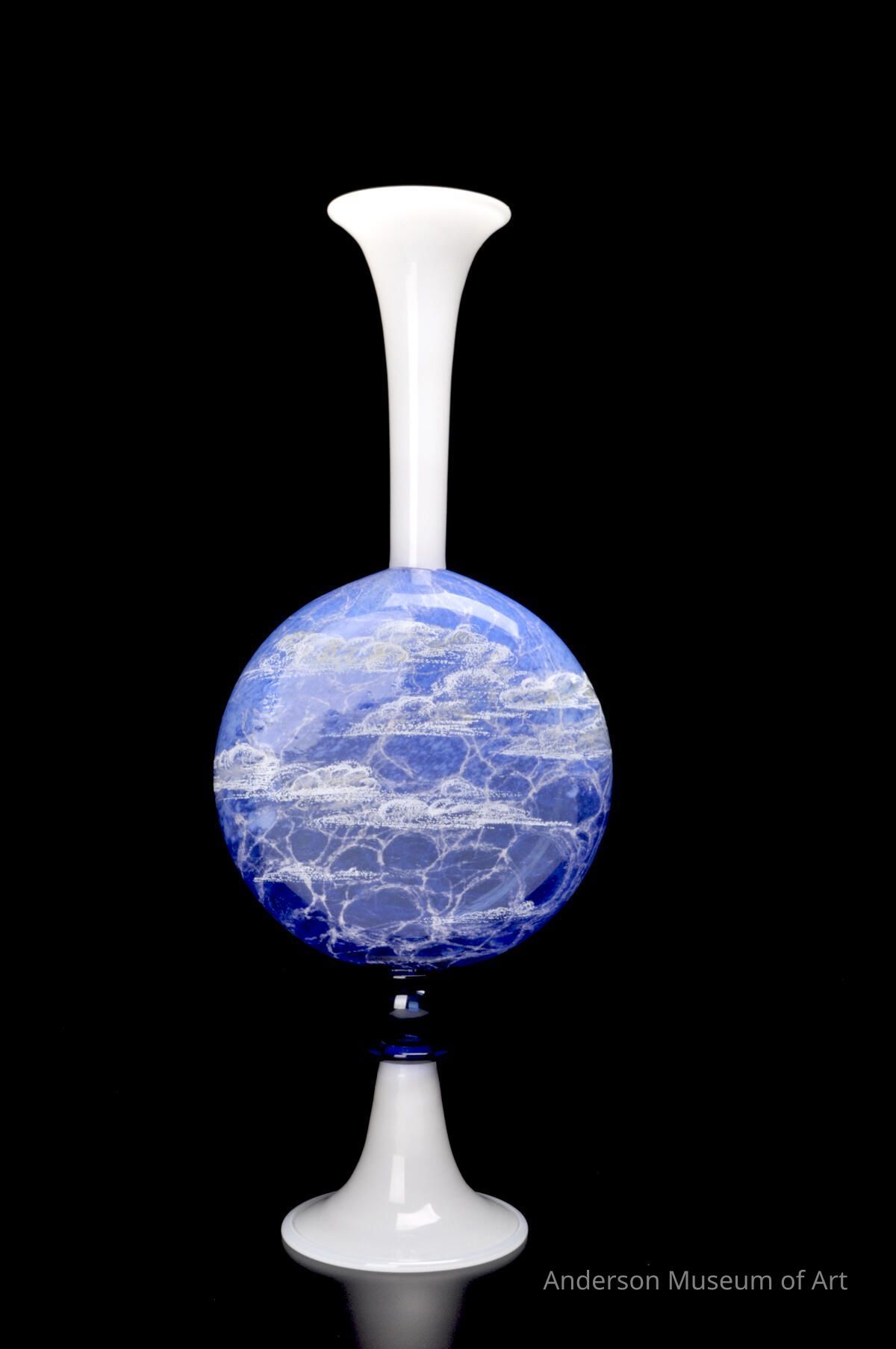 Blue and white glass vase. The foot and neck of the vase are an opaque white. The neck has a long stem and then funnels outward. The foot is much shorter and connects to the body with a blue, clear, circular piece. The foot also funnels outward. The body of the piece is mostly a clear blue. As you look into the body, a second layer is visible with random wisps of white throughout, creating a marbleized look. The outside layer is decorated with white cloud shapes.Type of Sculpture