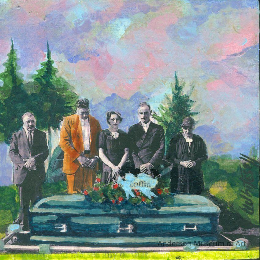 The collage itself is a 4" x 4" x 3/4" square attached to a black background and aligned in the upper half of the framed piece. The collage contains an image of three men, one in an orange suit, and two women looking at a blue coffin. Right above the flowers on the coffin is the word coffin in print. The background depicts a painted outdoor scene with pine trees and a cloudy pink and blue sky. There is one small yellow stripe painted at the bottom.Collection