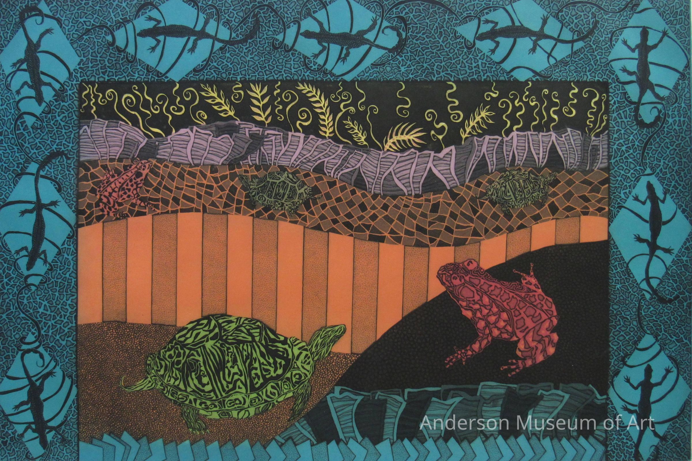 A horizontal image of two frogs and three turtles in a colorful landscape setting is surrounded by a patterned blue field located with nine unpatterned blue diamonds. In each diamond are three newts. The entire image is a study of contrasting and often clashing patterns, some striped, some tessellated, some free-formed like the snake's scales. Below the image in the lower-left corner is written in pencil "Nine Newts," and in the lower center regions is written "6/16," and in the lower right corner is signed "Sarojini Jha." Appears to have been printed on pure cotton fiber paper.Collection